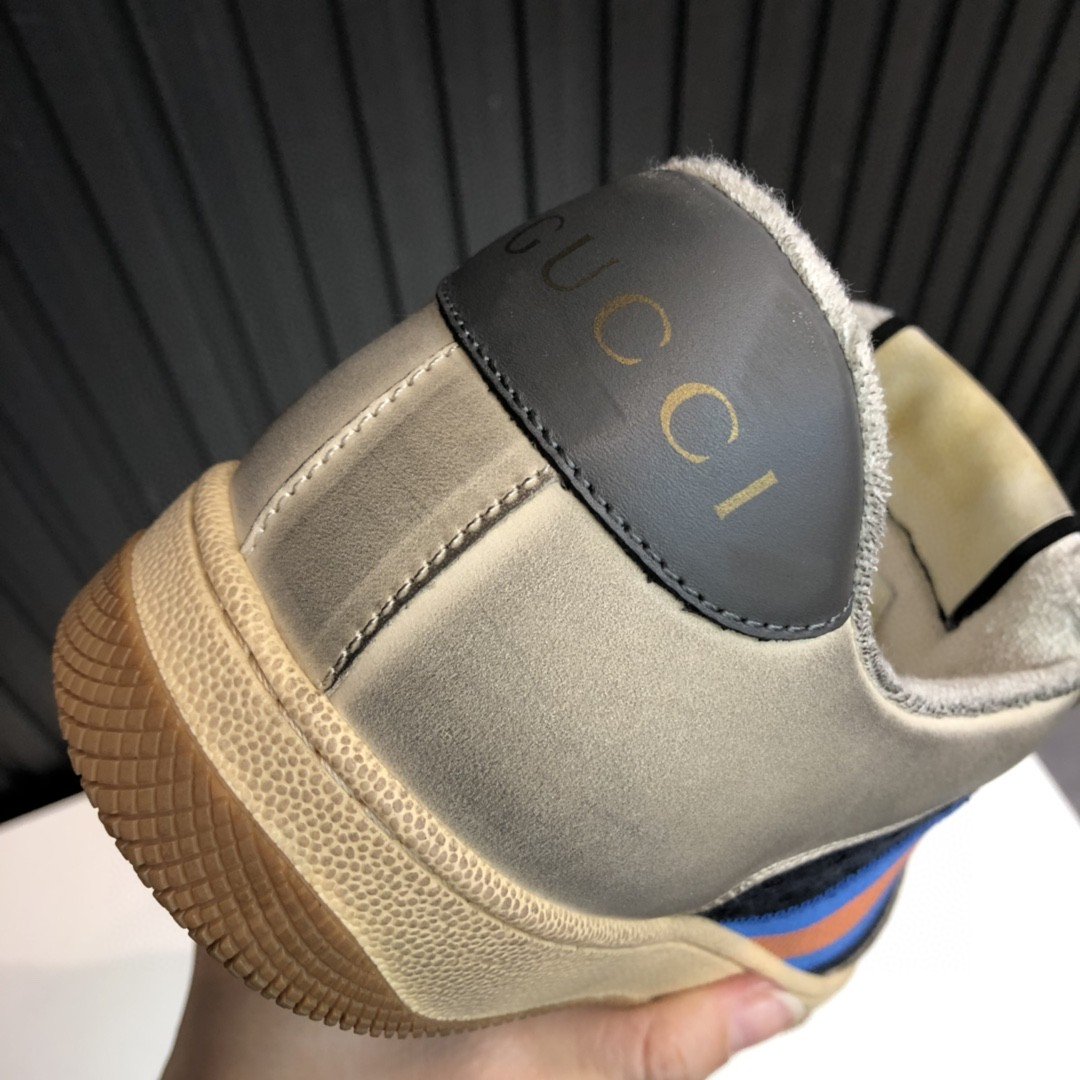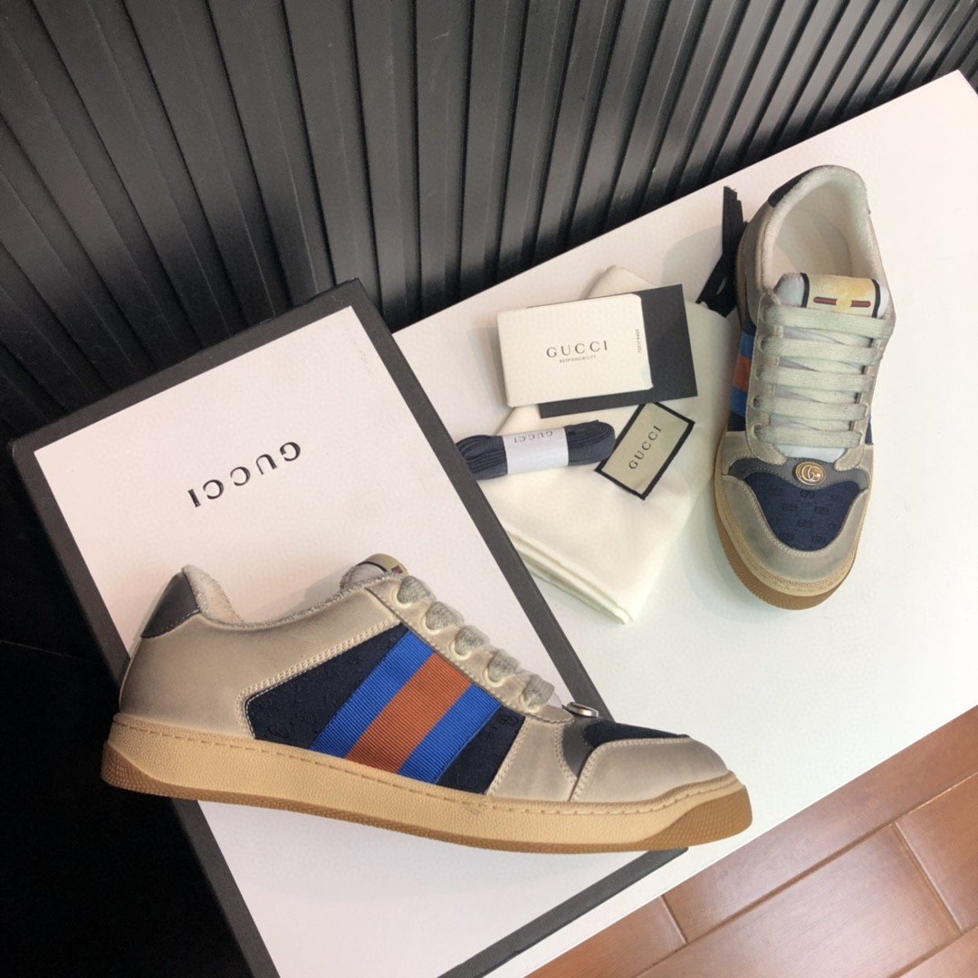 受 70 年代经典运动鞋的影响,Screener 运动鞋以防御性运动命名,侧面饰有织带条纹,复古风格Gucci 徽标经过整体仿旧效果处理。 2019 早秋系列融合了数十年的不同影响,继续参考受复古运动装启发的老派形状和材质。