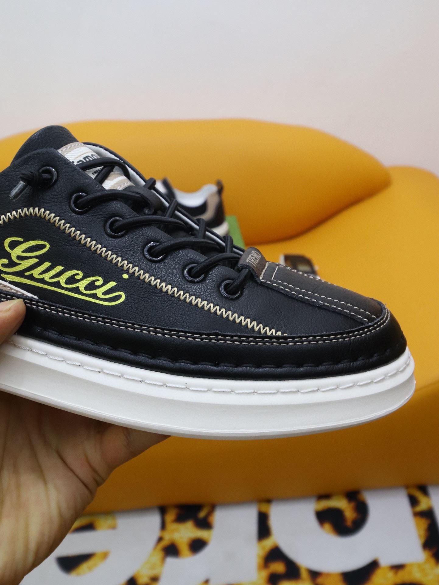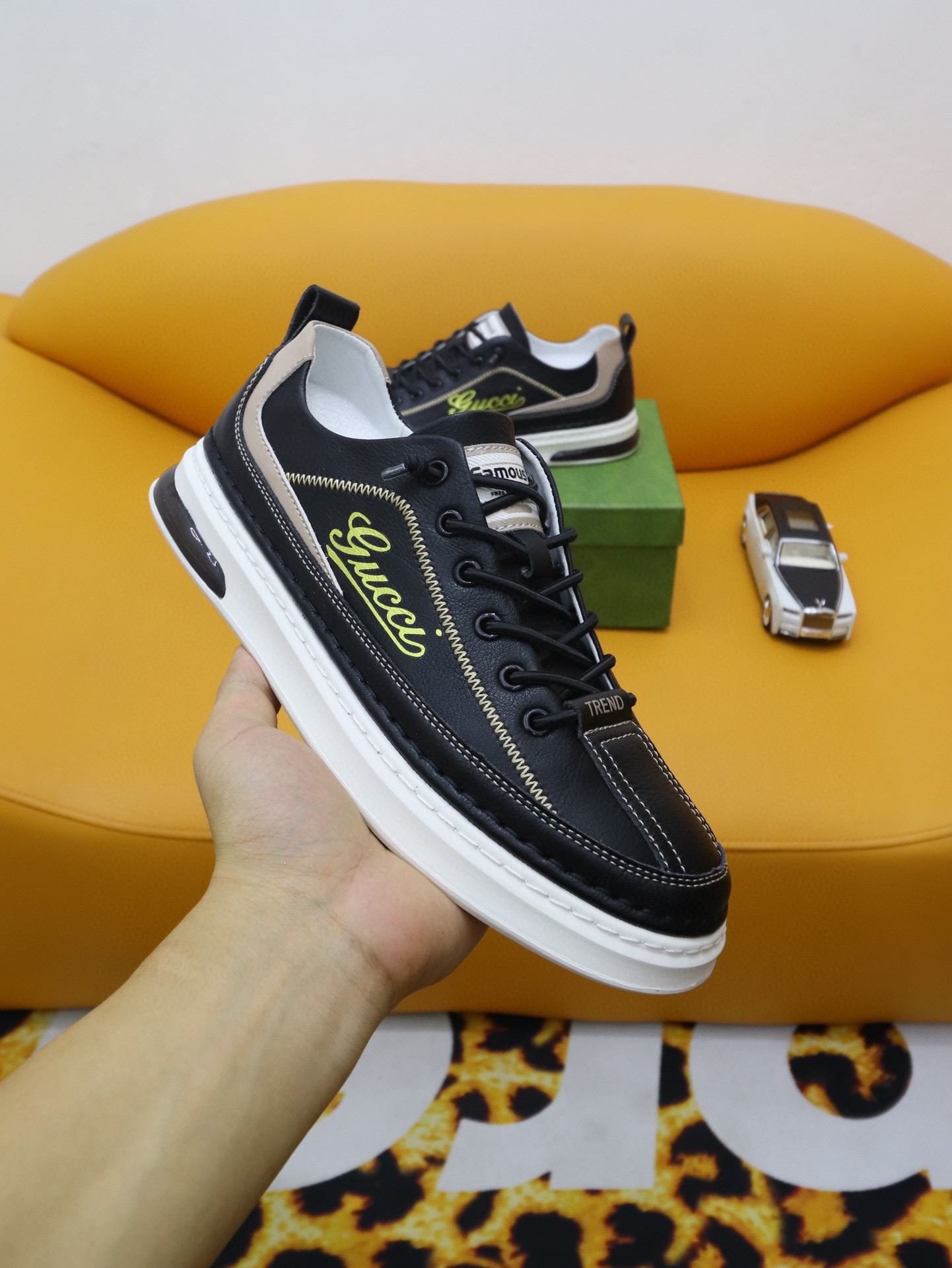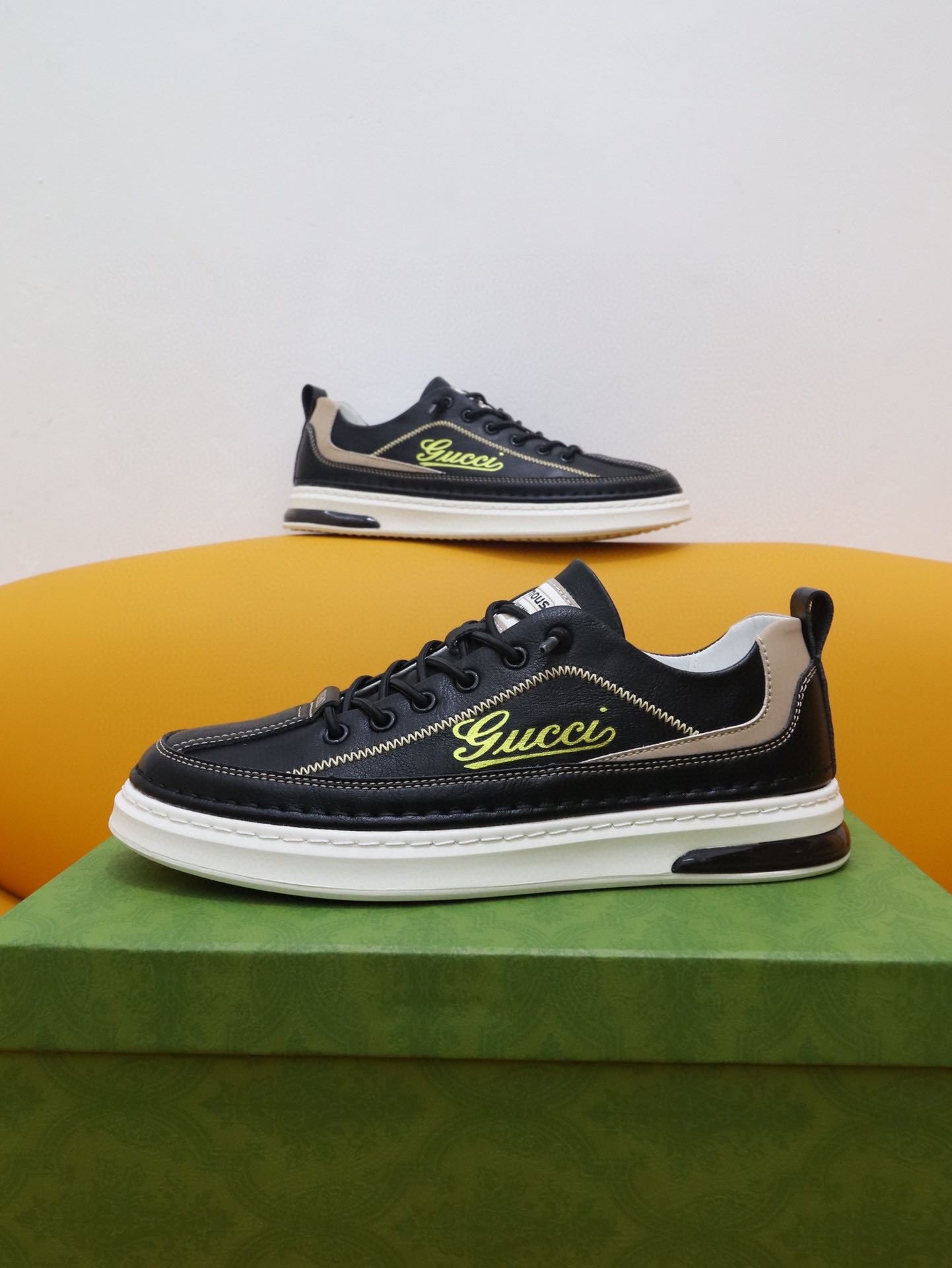 Gucci 男士运动鞋,配以 Gucci 金色印花黑色男士