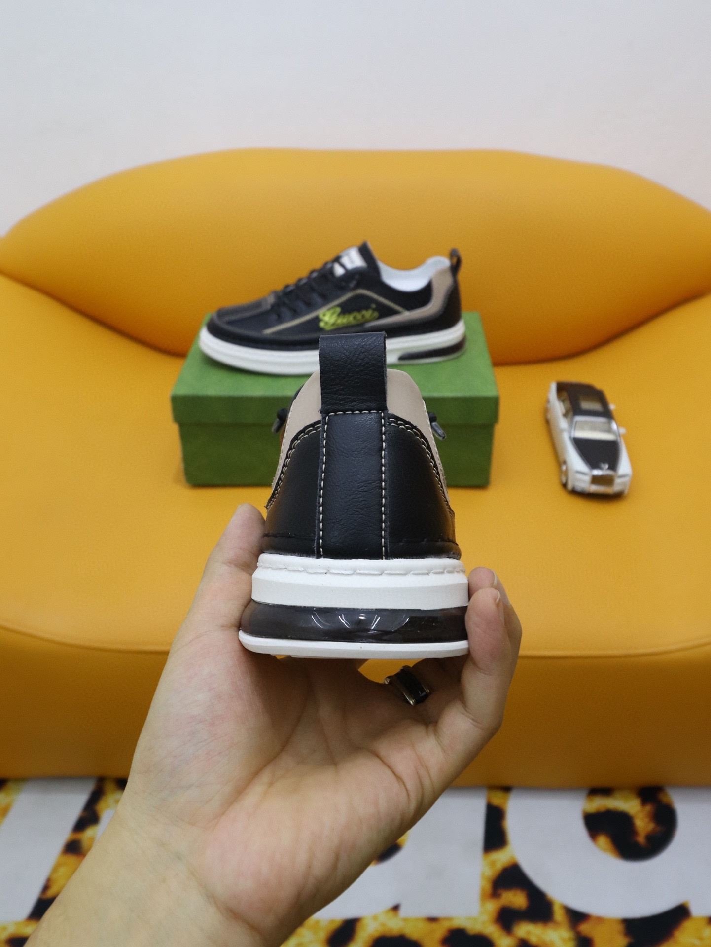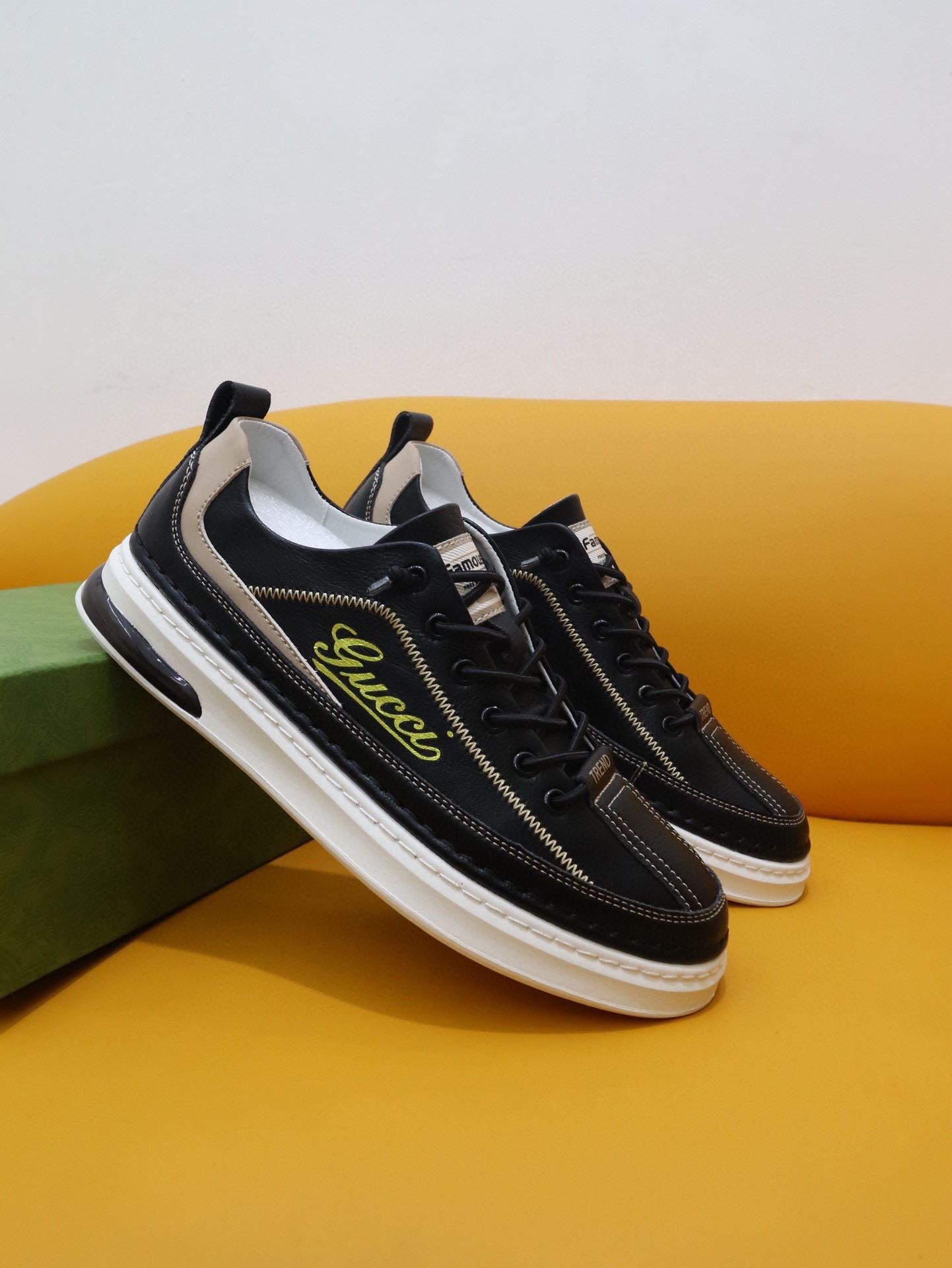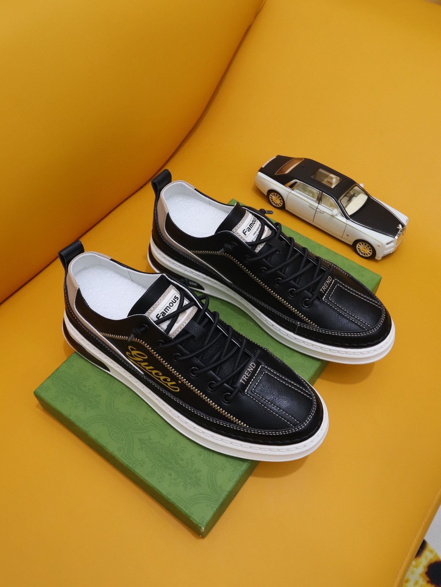 Gucci 男士运动鞋,配以 Gucci 金色印花黑色男士