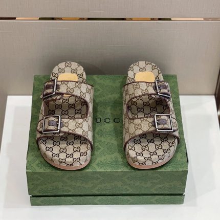 一双平底凉鞋,采用米色和乌木色的花押字帆布制成。 GG 标志首次使用于 1970 年代,是 1930 年代原始 Gucci 菱形设计的演变,从那时起,它就成为 Gucci 传统的既定象征。
