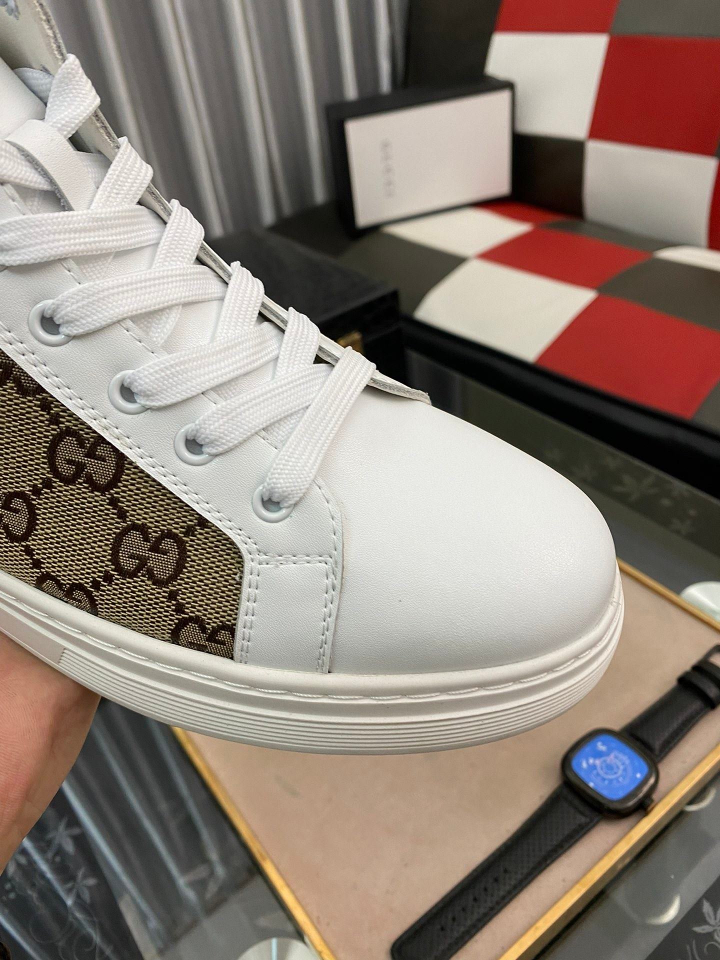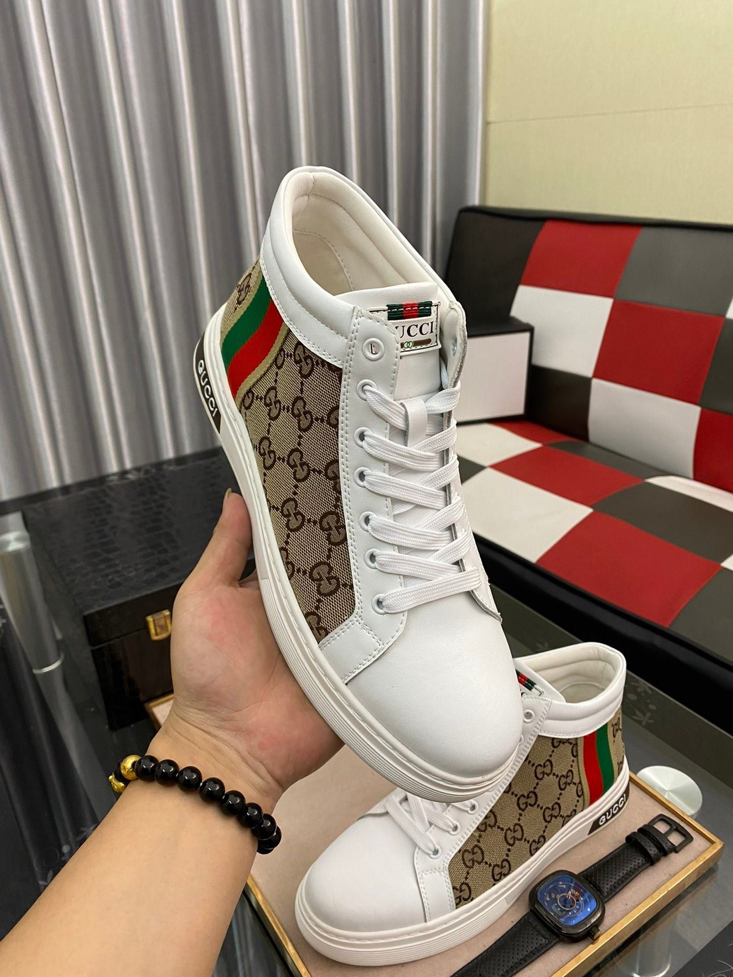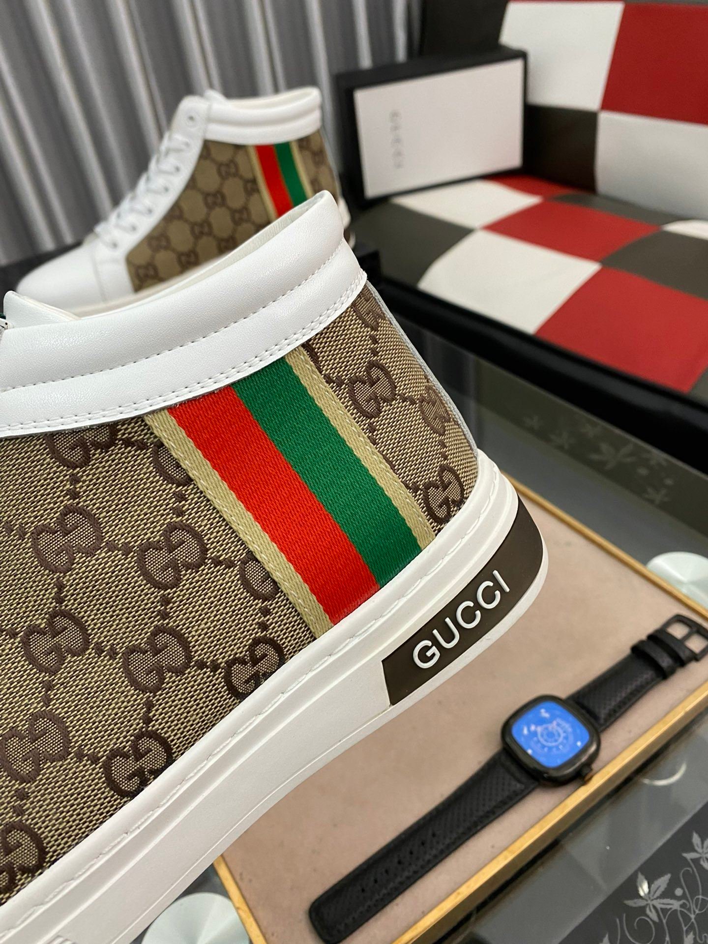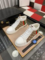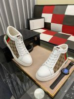 Gucci 男士 GG Ace 高帮男式织带运动鞋,白色和棕色