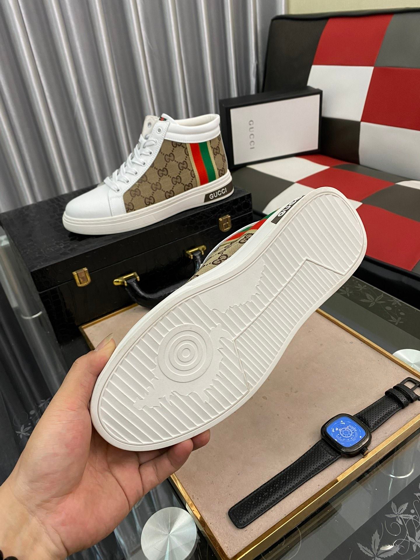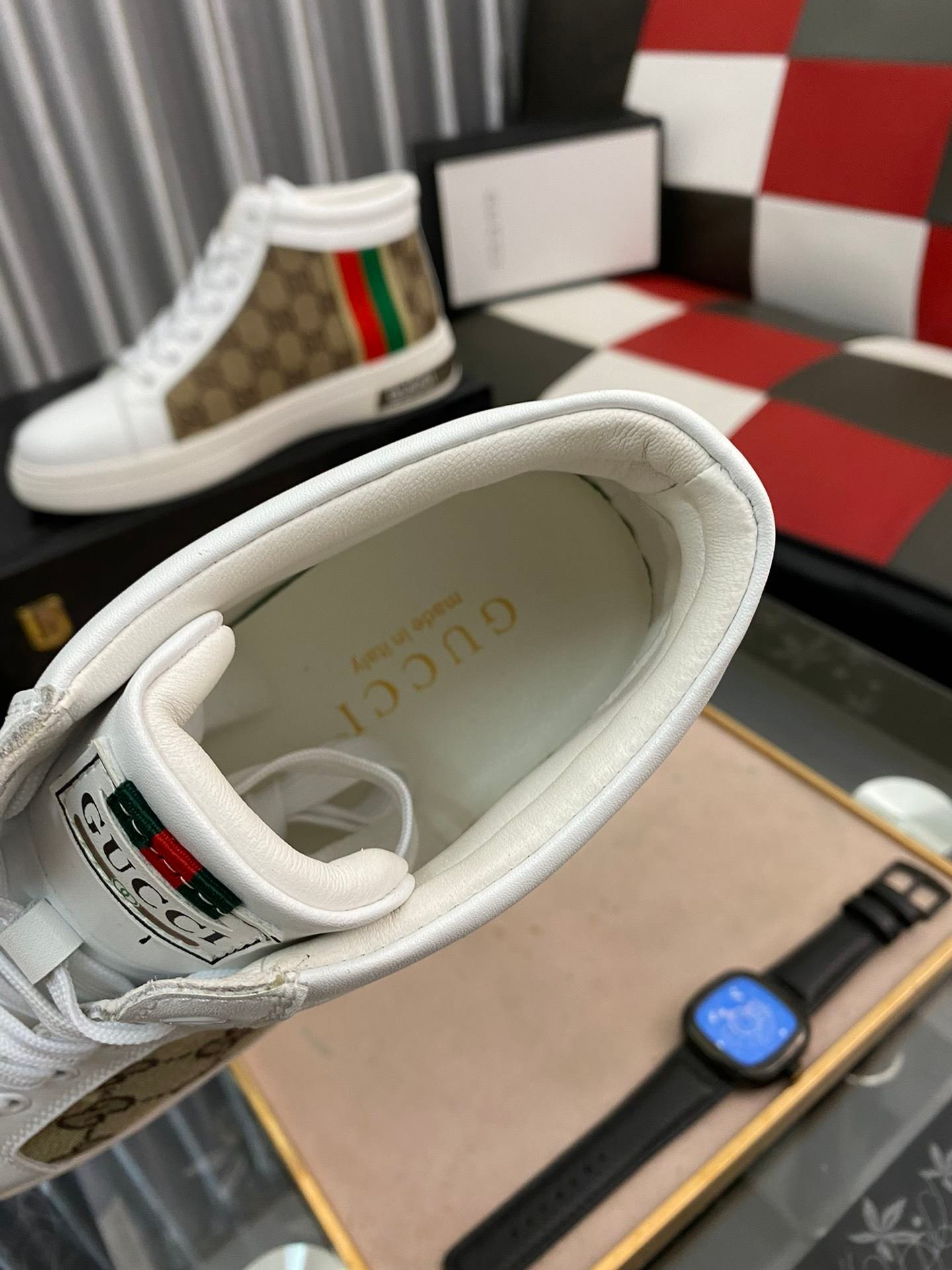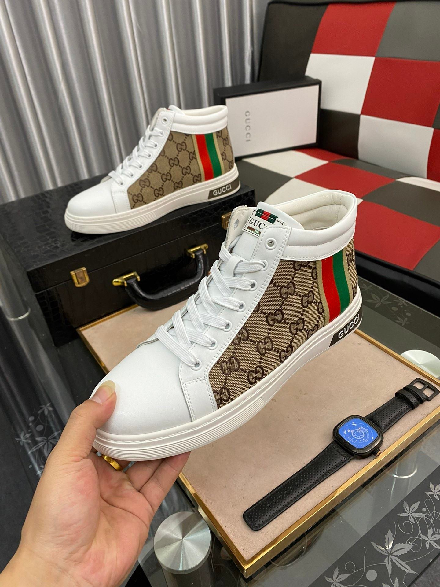 Gucci 男士 GG Ace 高帮男式织带运动鞋,白色和棕色