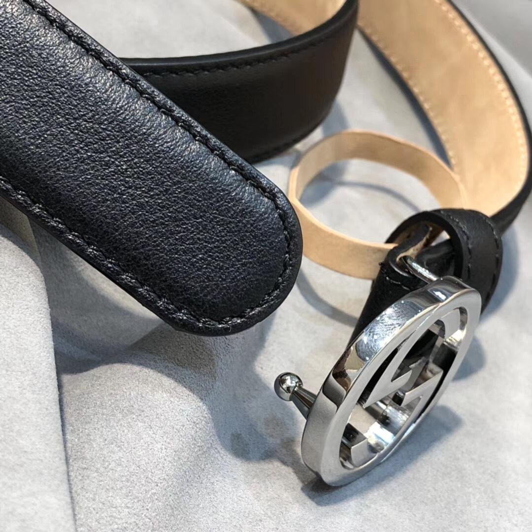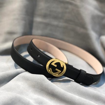 由互锁 G 带扣定义的黑色腰带。这些档案继续成为整个 Gucci 系列的丰富灵感来源。作为品牌的历史标志,字母组合五金件向品牌创始人 Guccio Gucci 致敬。