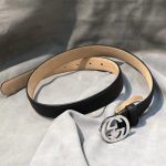 Gucci 腰带,带互锁 G 带扣黑色/奶油色 GG,女士腰带 370717