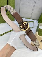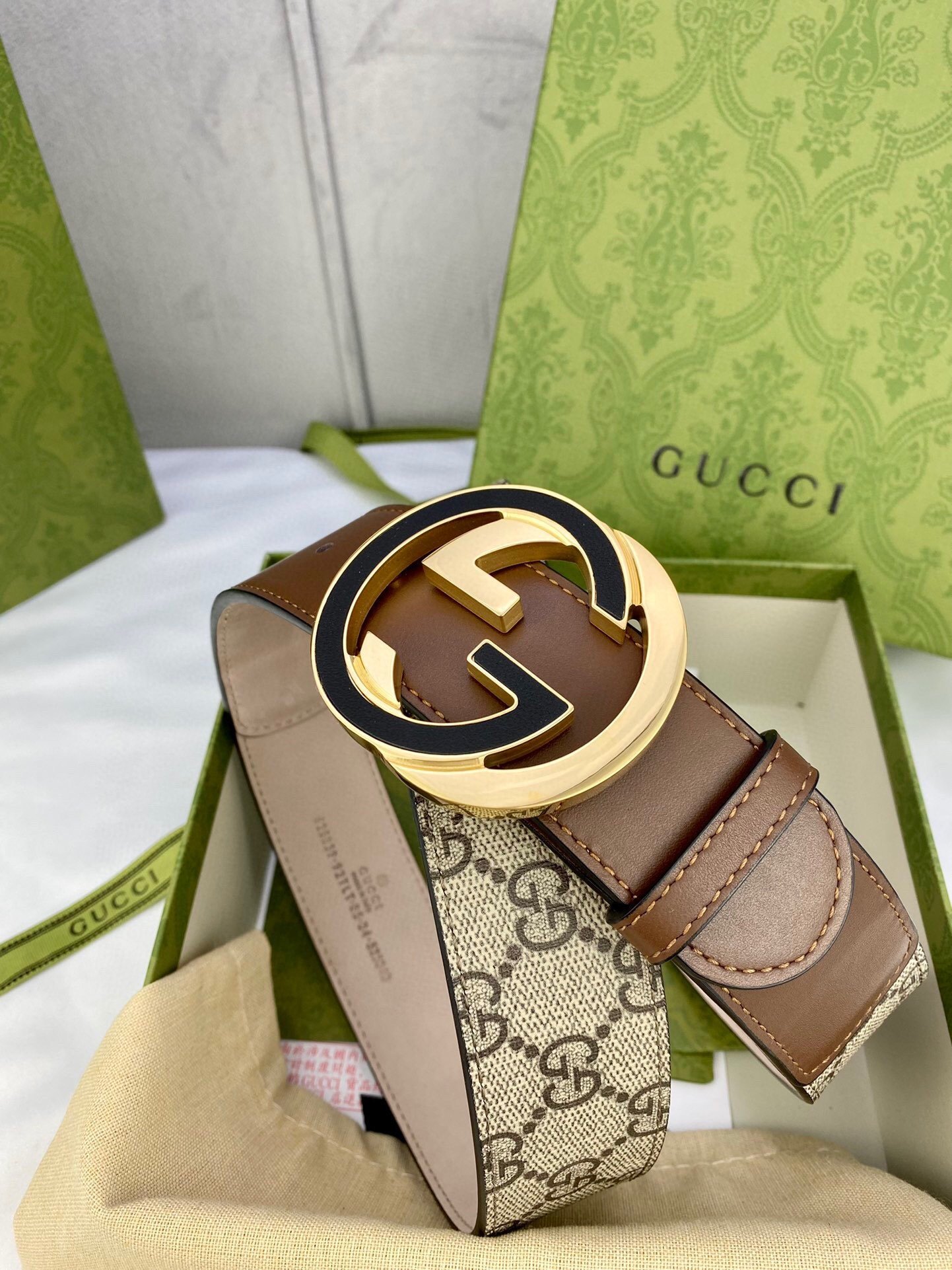 我们经典腰带上的互扣 G 扣,采用 GG Supreme 帆布制成。其标志性的米色/乌木色组合与棕色相搭配,推出这款腰带