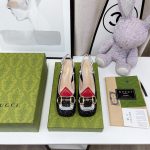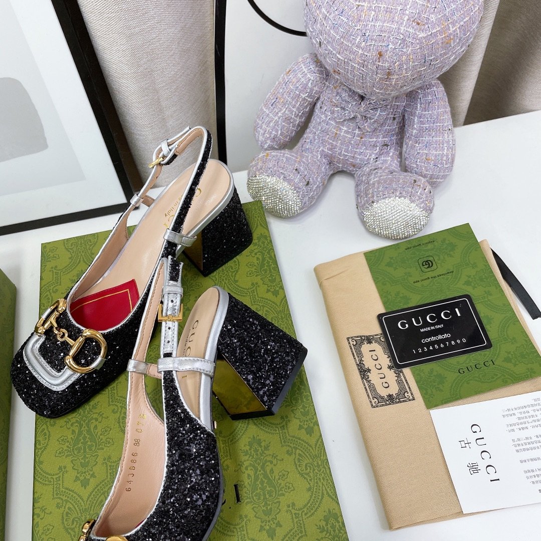 品牌以色彩缤纷的色调呈现出异想天开的成衣、鞋履和配饰系列。作为对 Gucci 传统的欢乐重新诠释,心形和菱形图案与花卉元素一起出现,为该系列产品注入了颂扬爱情的浪漫气息。这双露跟高跟鞋采用彩色水晶制成,并配有马衔扣五金配件。
