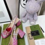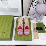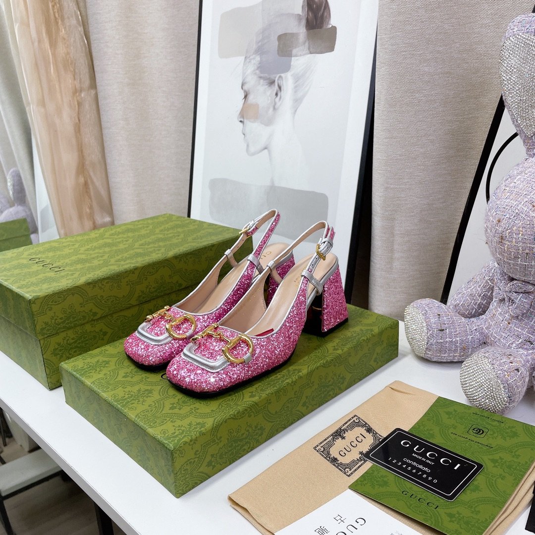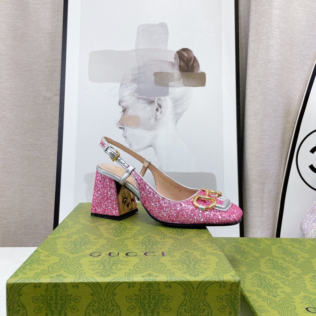 品牌以色彩缤纷的色调呈现出异想天开的成衣、鞋履和配饰系列。作为对 Gucci 传统的欢乐重新诠释,心形和菱形图案与花卉元素一起出现,为该系列产品注入了颂扬爱情的浪漫气息。这双露跟高跟鞋采用彩色水晶设计,并配有马衔扣五金配件。