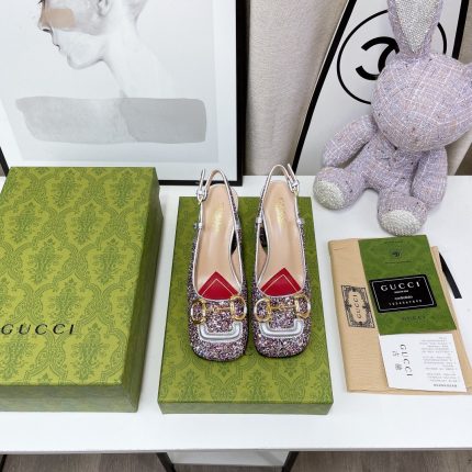品牌以色彩缤纷的色调呈现异想天开的成衣、鞋履和配饰系列。作为对 Gucci 传统的欢乐重新诠释,心形和菱形图案与花卉元素一起出现,为该系列产品注入了颂扬爱情的浪漫气息。这双芭蕾平底鞋采用彩色水晶制成,并配有马衔扣五金配件。