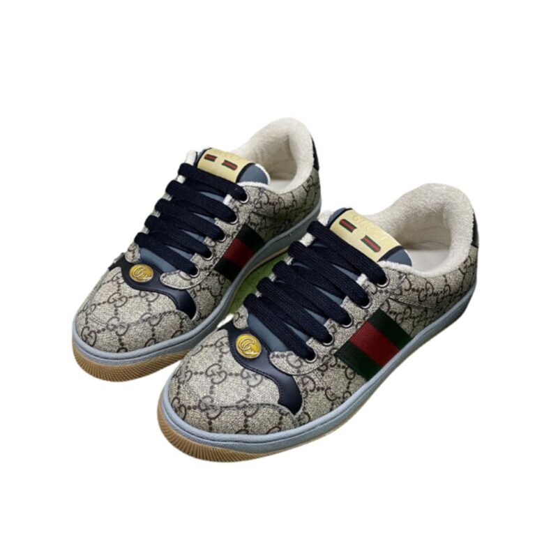 双 G 古董金色金属配件镶嵌在这些拖鞋的蓝色和红色织带丝带上。