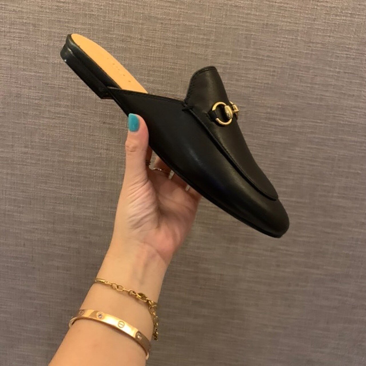 Princetown 拖鞋是自 2015 年秋冬时装秀首次亮相以来的必备 Gucci 款式,以黑色呈现。穆勒鞋设计采用独特的金色马衔扣,这是受马术世界启发的档案符号。