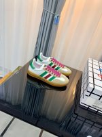 这款运动鞋属于 adidas * Gucci 系列,饰有 Gucci 三叶草印花。阿迪达斯 (adidas) 和古驰 (Gucci) 合作推出了一个系列,其中 Web 与三个白色条纹并列,而 GG 字母组合则与三叶草相结合。创意总监从 80 年代和 90 年代的记忆中汲取灵感,标志性的 Houses 图案与历史悠久的运动服装品牌 adidas 的图案相融合,打造出一系列混合外观。