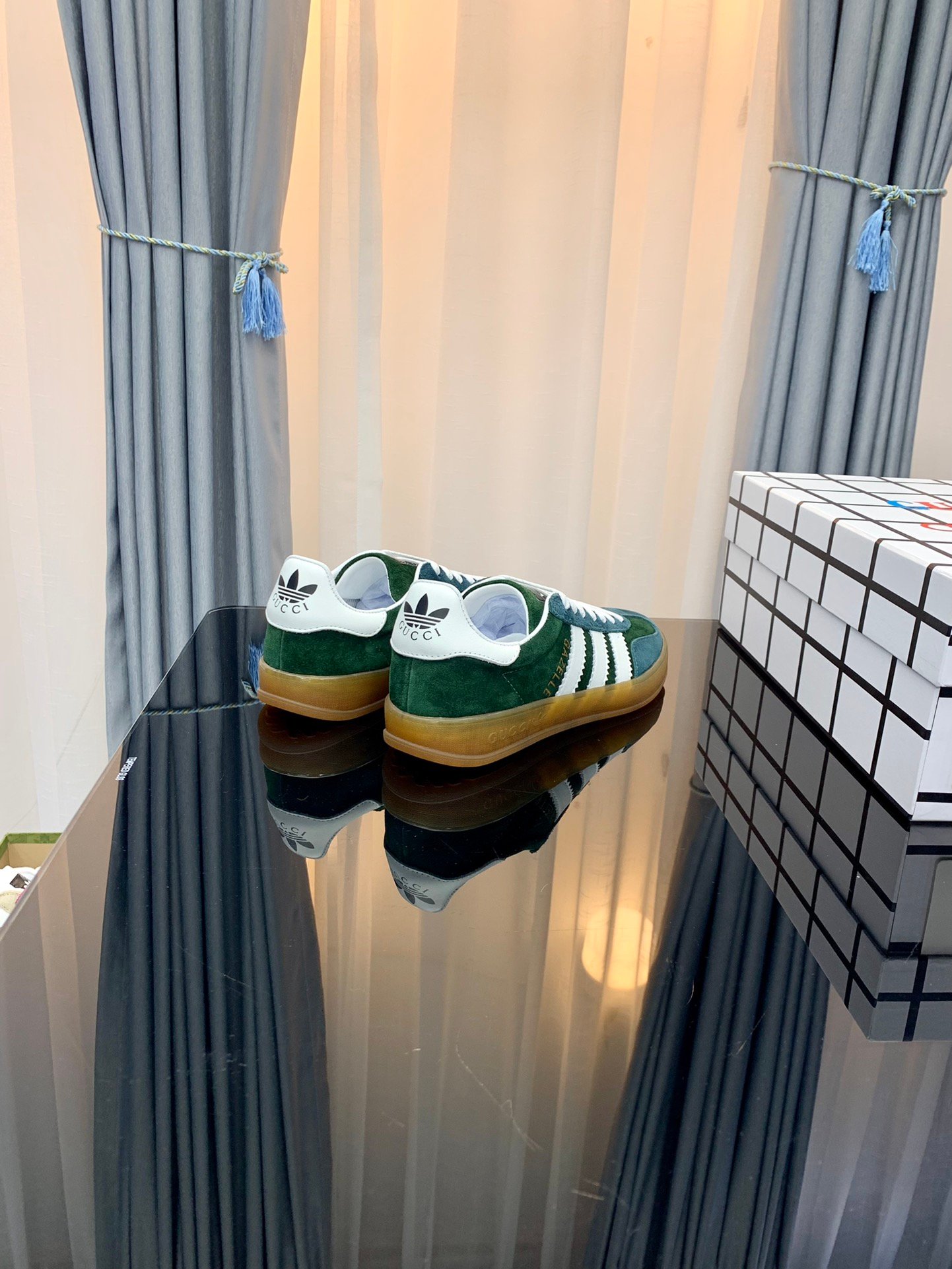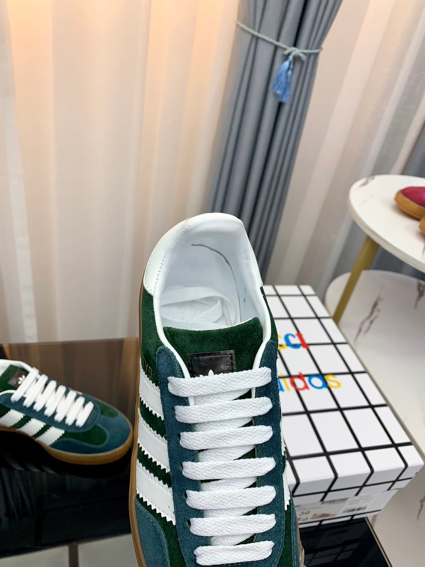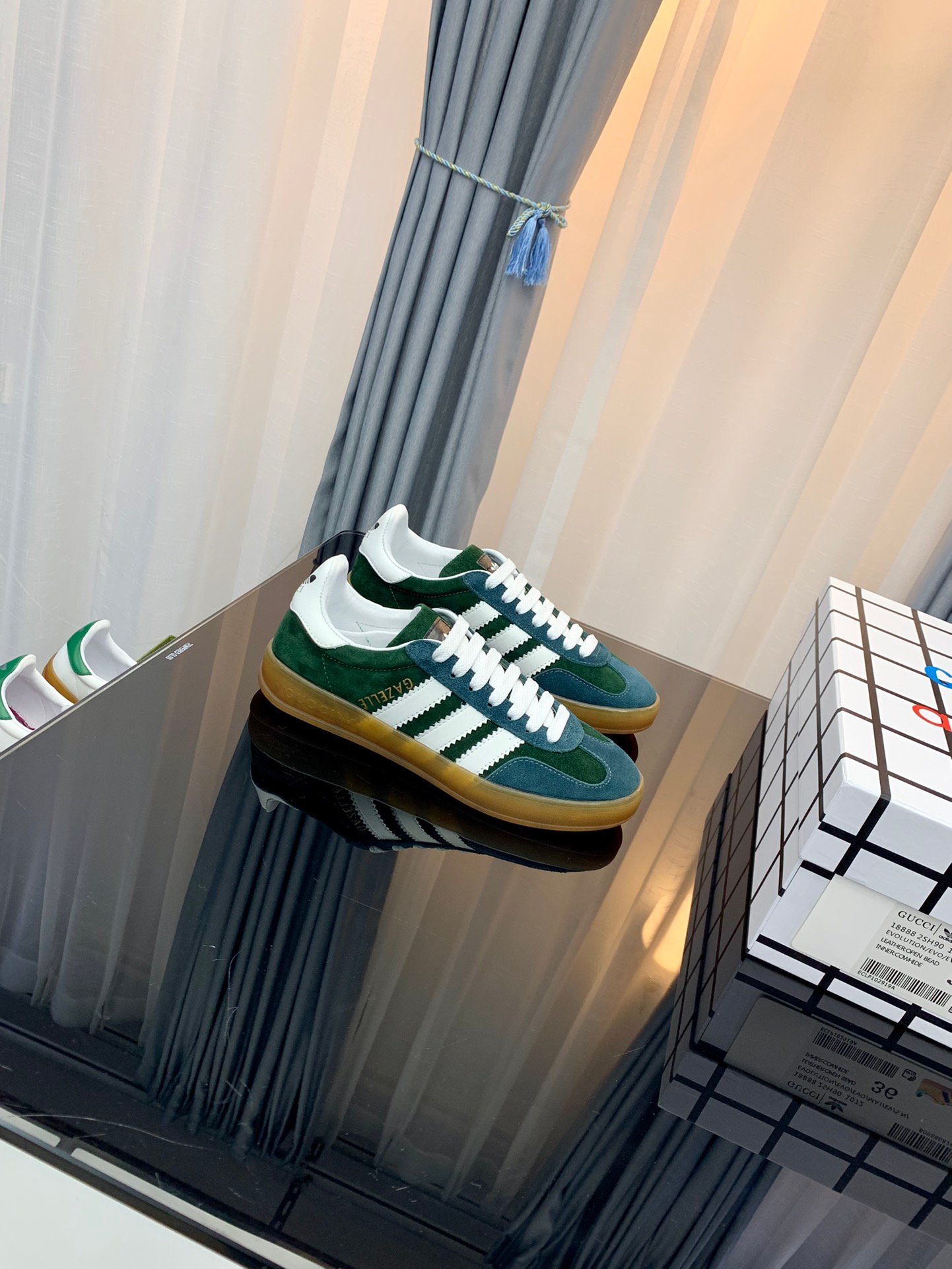 adidas * Gucci 系列的一部分,这款运动鞋采用 Gucci 三叶草印花。阿迪达斯 (adidas) 和古驰 (Gucci) 合作推出了一个系列,其中 Web 与三个白色条纹并列,而 GG 字母组合则与三叶草相结合。创意总监从 80 年代和 90 年代的回忆中汲取灵感,标志性的 Houses 图案与历史悠久的运动服饰品牌 adidas 的图案相融合,打造出一系列混合外观。