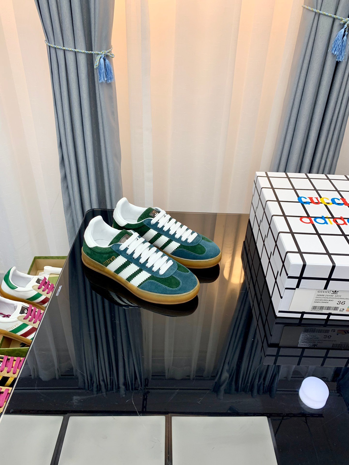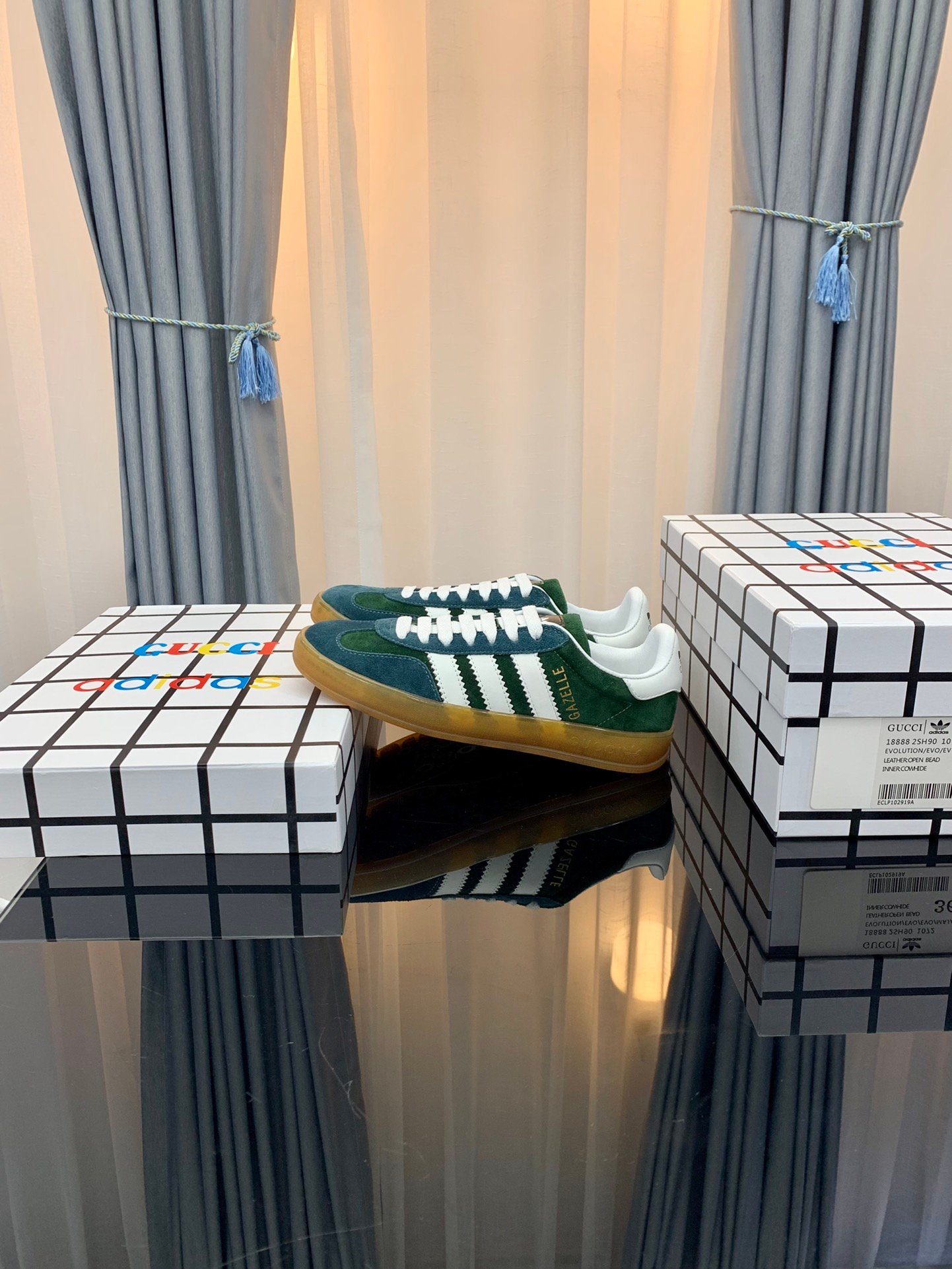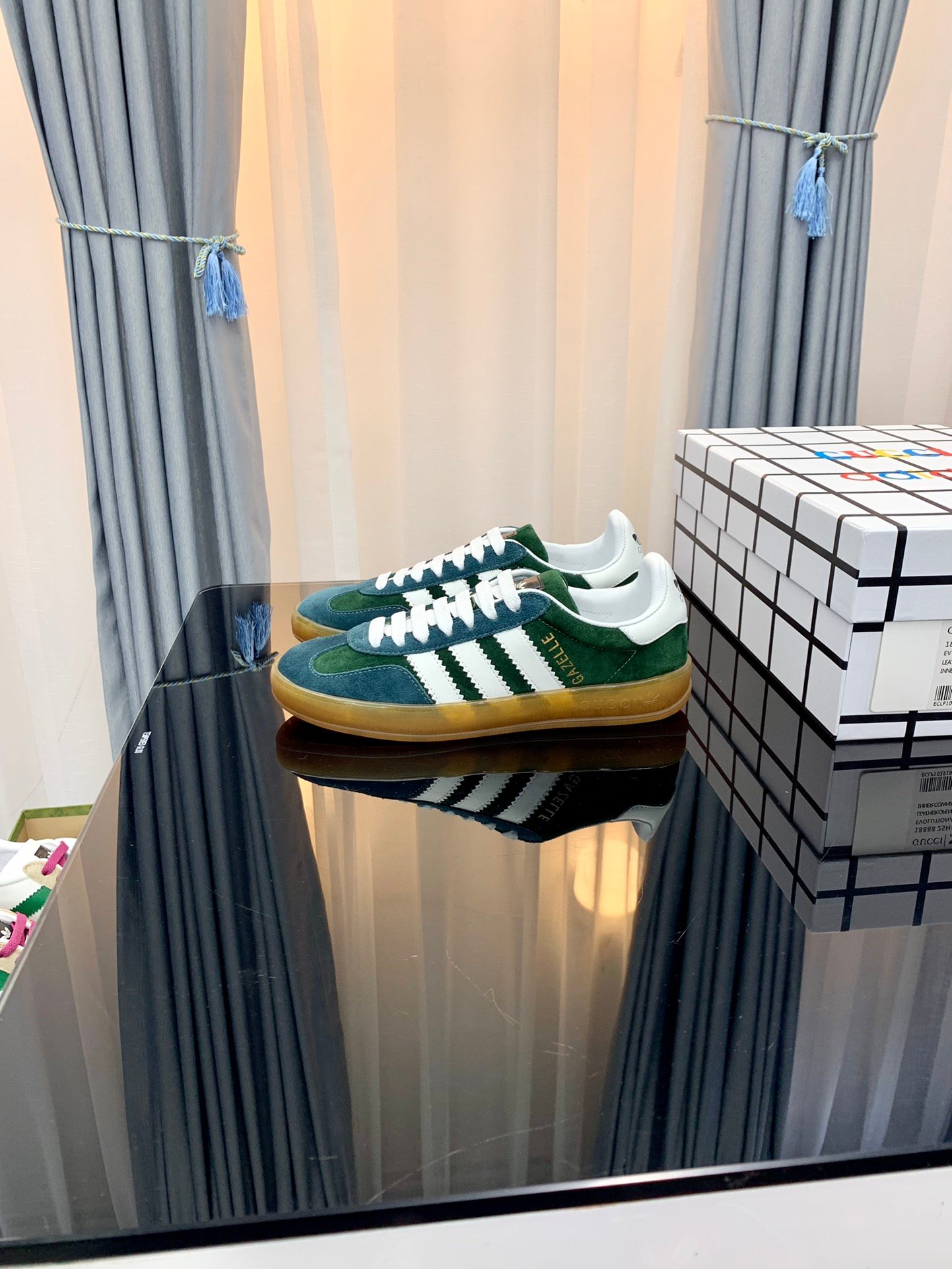 adidas * Gucci 系列的一部分,这款运动鞋采用 Gucci 三叶草印花。阿迪达斯 (adidas) 和古驰 (Gucci) 合作推出了一个系列,其中 Web 与三个白色条纹并列,而 GG 字母组合则与三叶草相结合。创意总监从 80 年代和 90 年代的回忆中汲取灵感,标志性的 Houses 图案与历史悠久的运动服饰品牌 adidas 的图案相融合,打造出一系列混合外观。