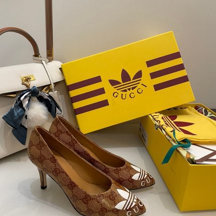 adidas * Gucci 系列的一部分,这款高跟鞋采用 Gucci 三叶草印花。阿迪达斯 (adidas) 和古驰 (Gucci) 合作推出了一个系列,其中 Web 与三个白色条纹并列,而 GG 字母组合则与三叶草相结合。创意总监从 80 年代和 90 年代的记忆中汲取灵感,标志性的 Houses 图案与历史悠久的运动服装品牌 adidas 的图案相融合,打造出一系列混合外观。