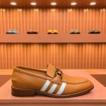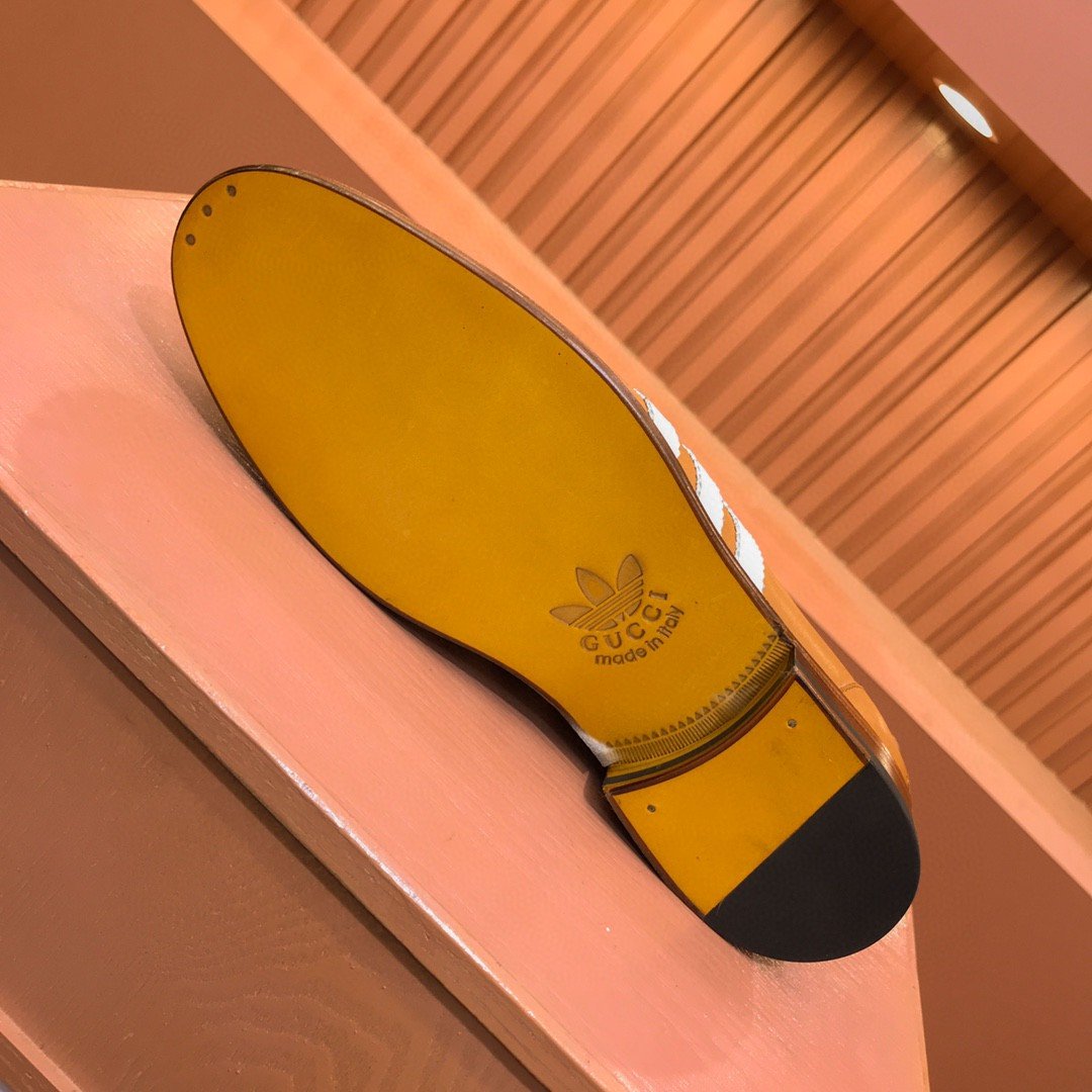 这款乐福鞋属于 adidas * Gucci 系列,采用 Gucci 三叶草金属嵌片。阿迪达斯 (adidas) 和古驰 (Gucci) 合作推出了一个系列,其中 Web 与三个白色条纹并列,而 GG 字母组合则与三叶草相结合。从创意总监对 80 年代和 90 年代的记忆中汲取灵感,标志性的 Houses 图案与历史悠久的运动服装品牌 adidas 的图案相融合,打造出一系列混合外观。