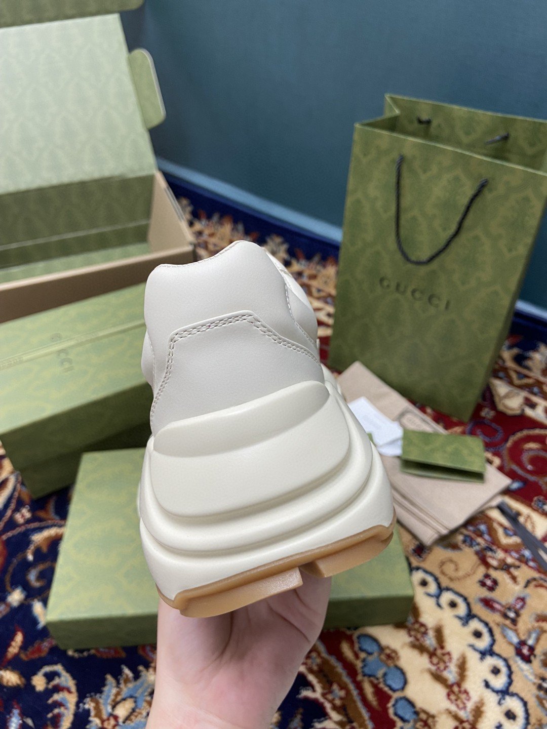 这款 Rhyton 运动鞋主要由 Demetra 制成。这种新材料采用与鞣制相同的工艺制成,具有柔韧、有弹性的性能和柔软的表面。这种环保材料结合了主要来自可持续、可再生和生物来源的无动物原料。