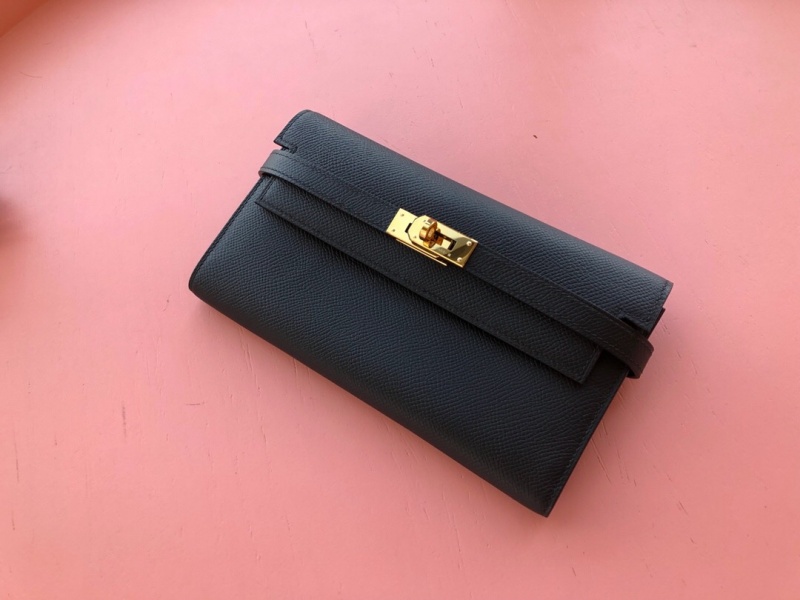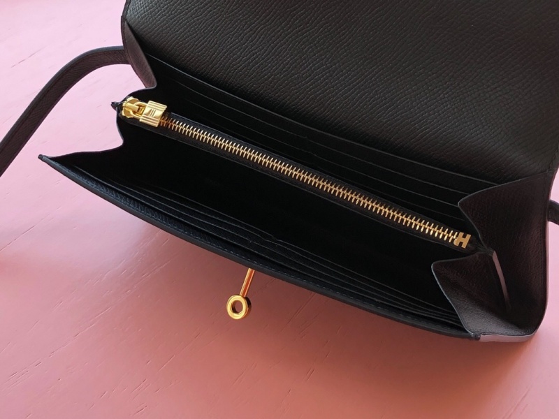 - 结构:凯莉小牛皮长钱包,配有12个卡槽,2个钞票口袋,拉链零钱包及镀钯Kelly锁扣