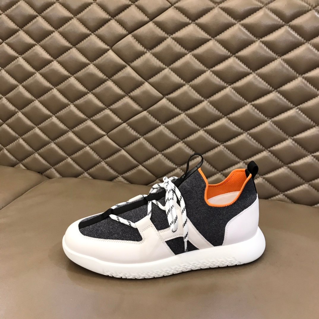 针织运动鞋,橡胶鞋底和标志性橙色滚边细节。
