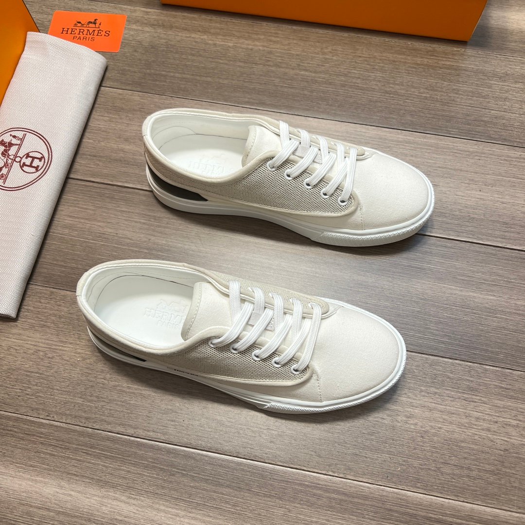 H、棉质和小羊皮运动鞋,适合夏季和现代风格。标志性细节:对比鲜明的“Herms”标签。