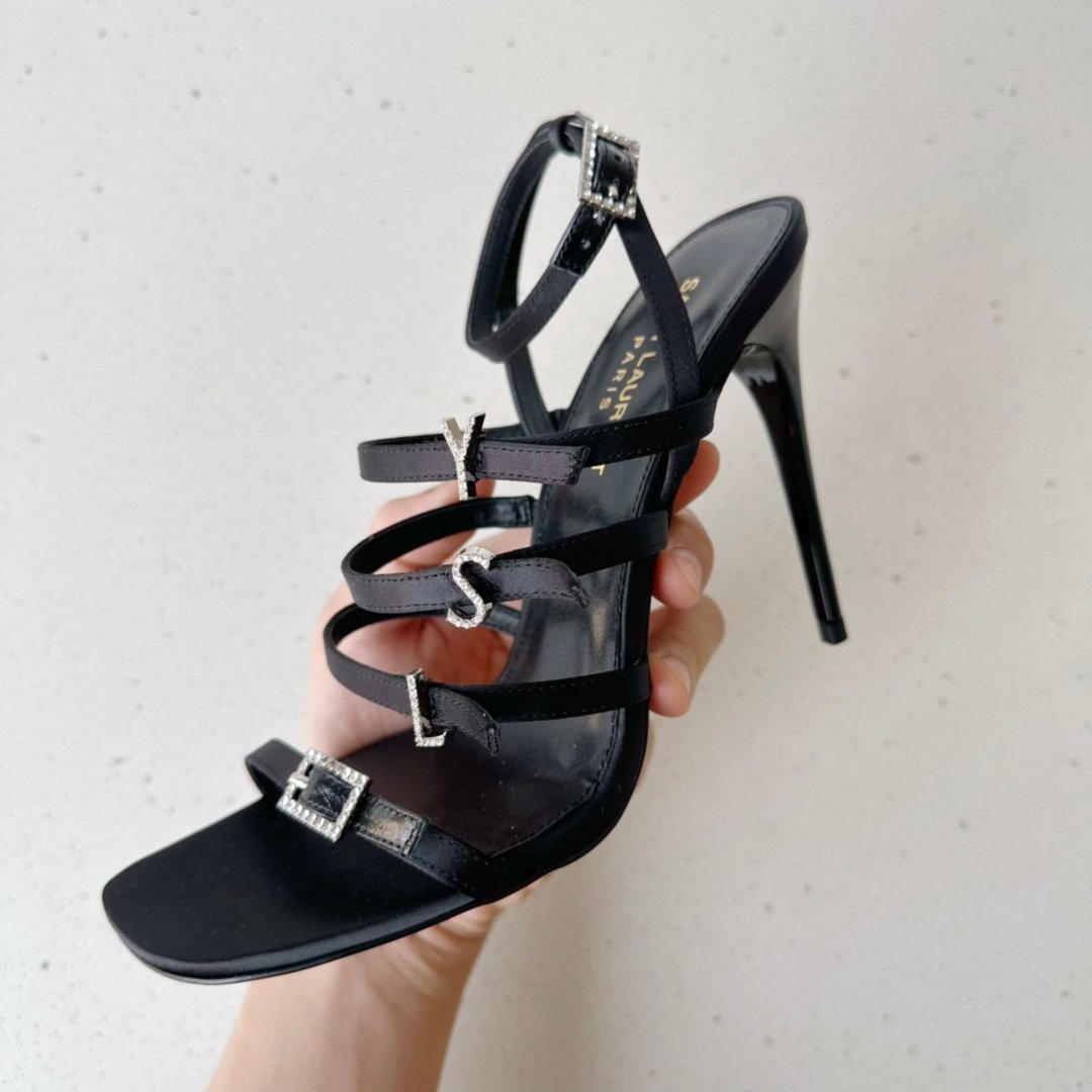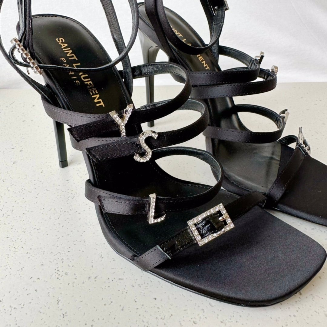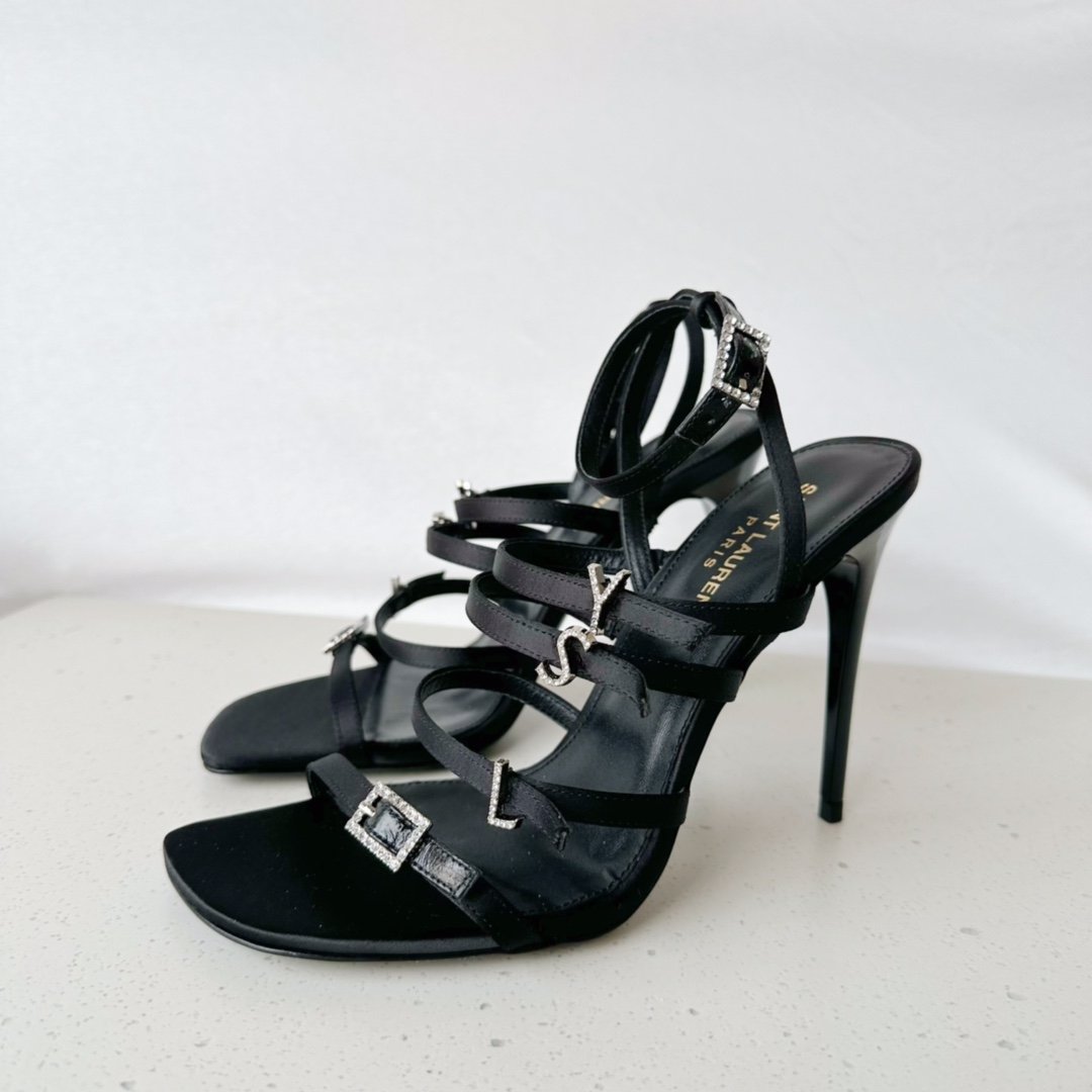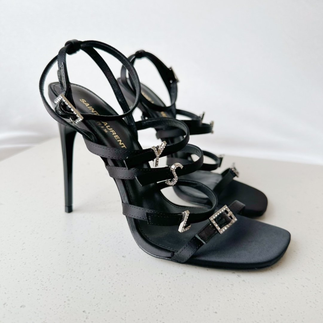 三条带子饰有莱茵石 ysl 缩写和包覆细高跟鞋跟。