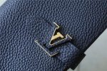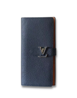 LV 垂直钱包是一款优雅的设计采用柔软、有颗粒感的材料制成。打开后即可看到对比鲜明的衬里,以及八个卡位、一个拉链零钱袋和一个用于存放票据和钞票的大 V 形插槽。这款钱包采用独特的滑扣设计,配有灵感源自标志性 Capucines 包的 LV 首字母配饰。