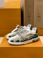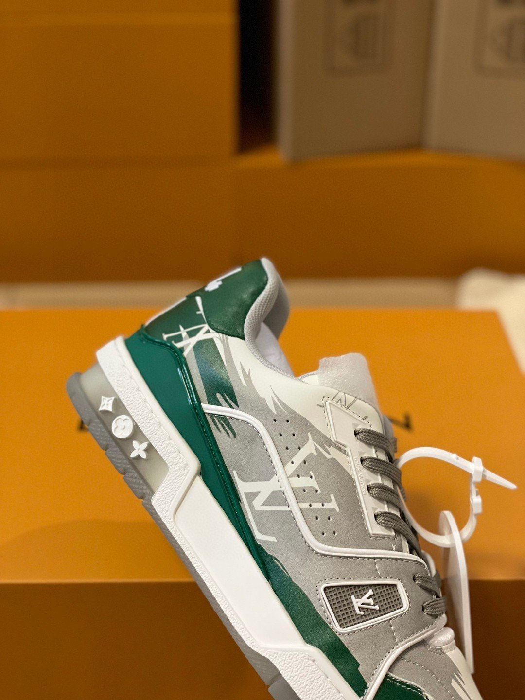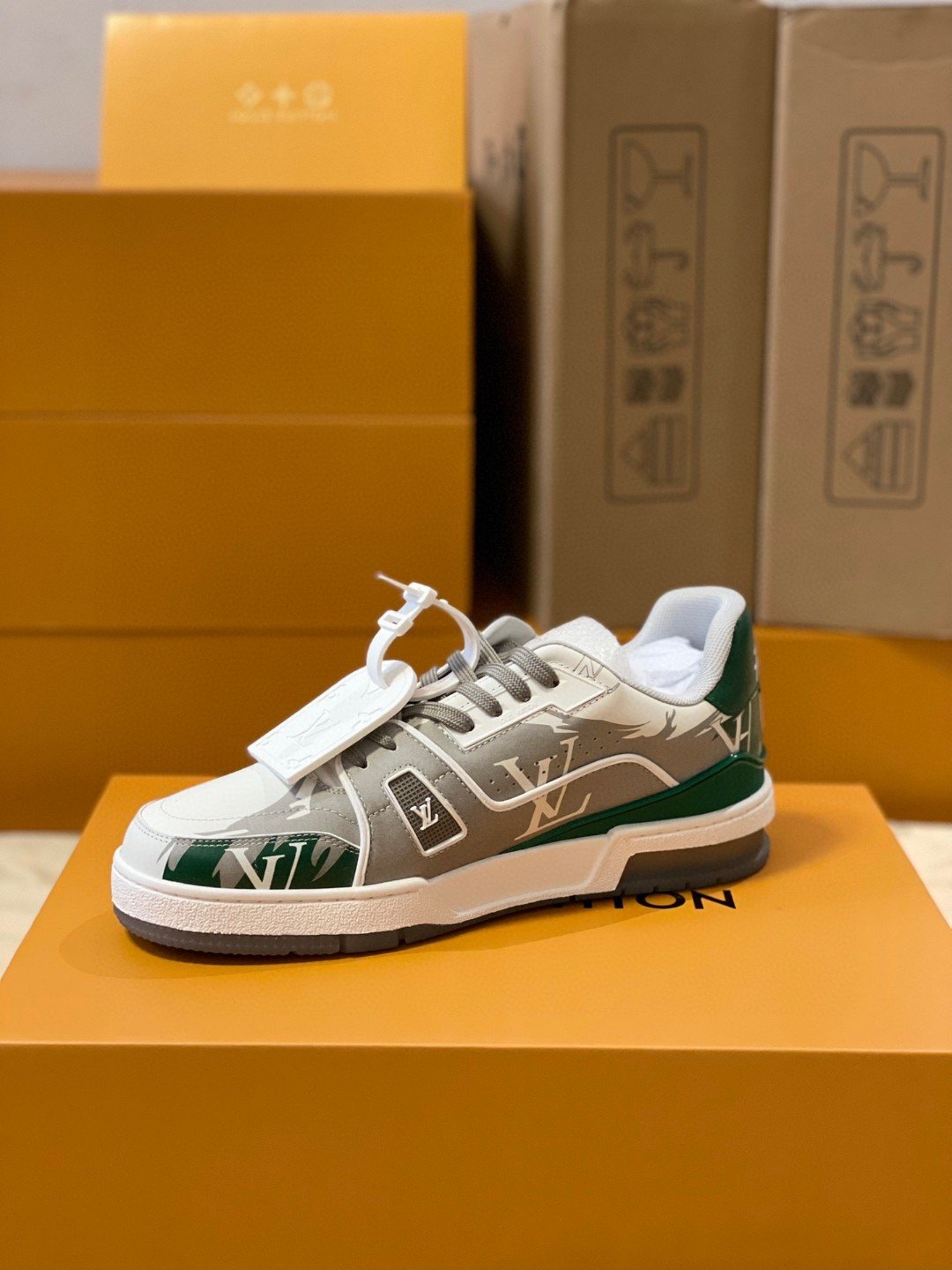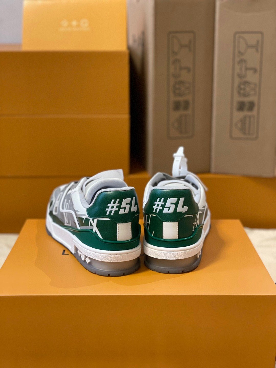 标志性的 LV Trainer 运动鞋以 Virgil Abloh 创作的印花图案重新演绎。图案鞋面搭配饰有 Monogram Flowers 的双色橡胶外底。该鞋款的鞋舌和侧面印有 LV 首字母,后背印有 #54 签名,指的是 1854 年,即路易威登创立的年份。