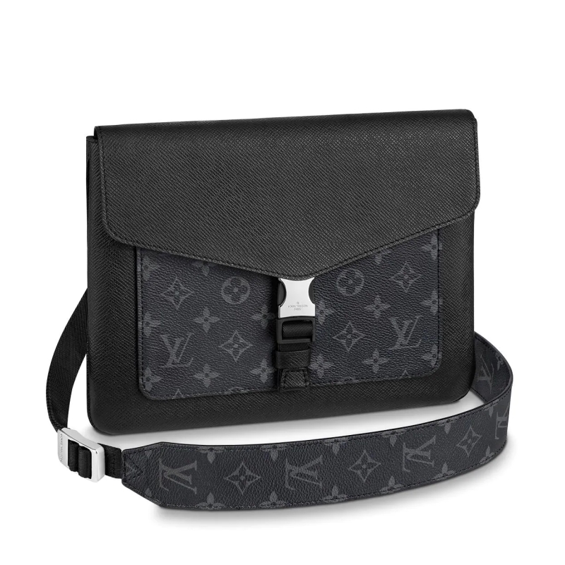 - 结构:- 外层为Monogram Eclipse涂层帆布 – 织物内衬 – 天然牛皮饰边 – 镀银金属饰件 – 1对可调节皮质肩带 – 顶部手柄 – 2个内贴袋 – 配有一个iPad内袋 – 拉链开合 –