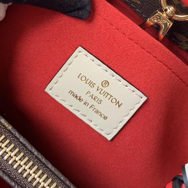 - 结构:Monogram 涂层帆布 光滑牛皮饰边 超细纤维内衬 2 个编织手柄,可手提或肘挎 可拆卸肩带,可肩背或斜挎 钩扣防止物品滑落 贴袋 4 颗底钉