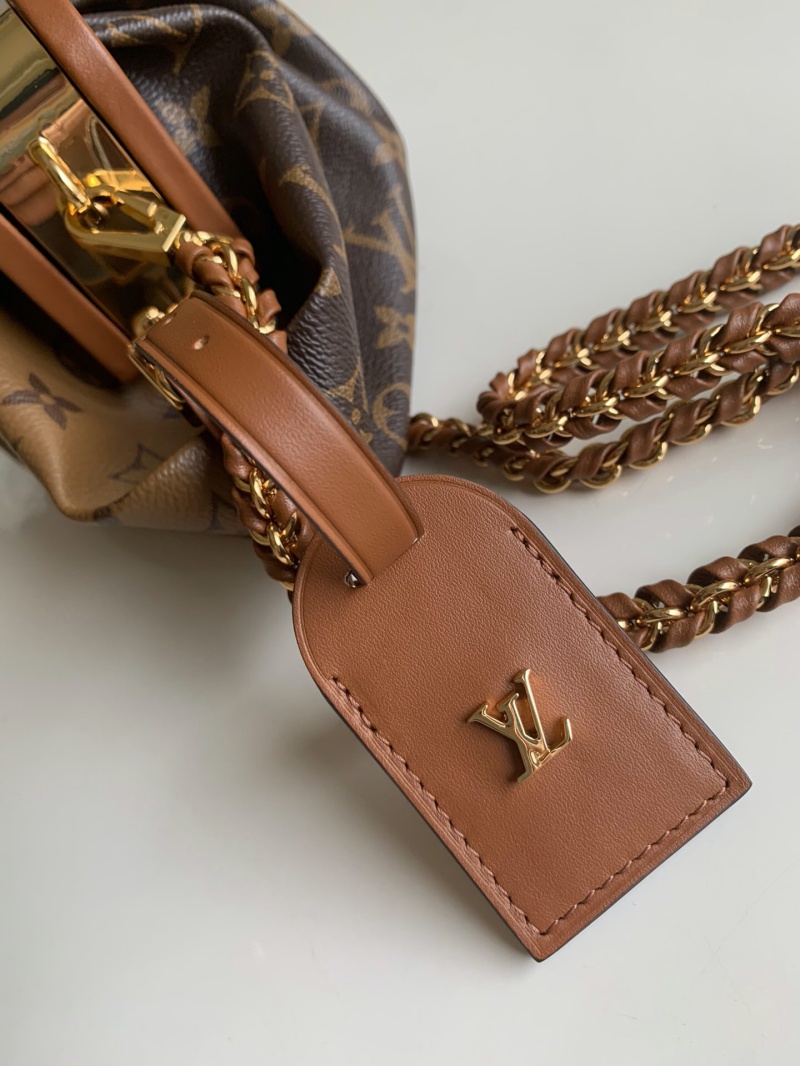 - 结构:Monogram 涂层帆布 小牛皮饰边 超细纤维内衬 金属件 可拆卸编织皮革链条肩带,可肩背或斜挎 按扣开合