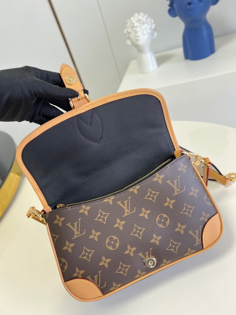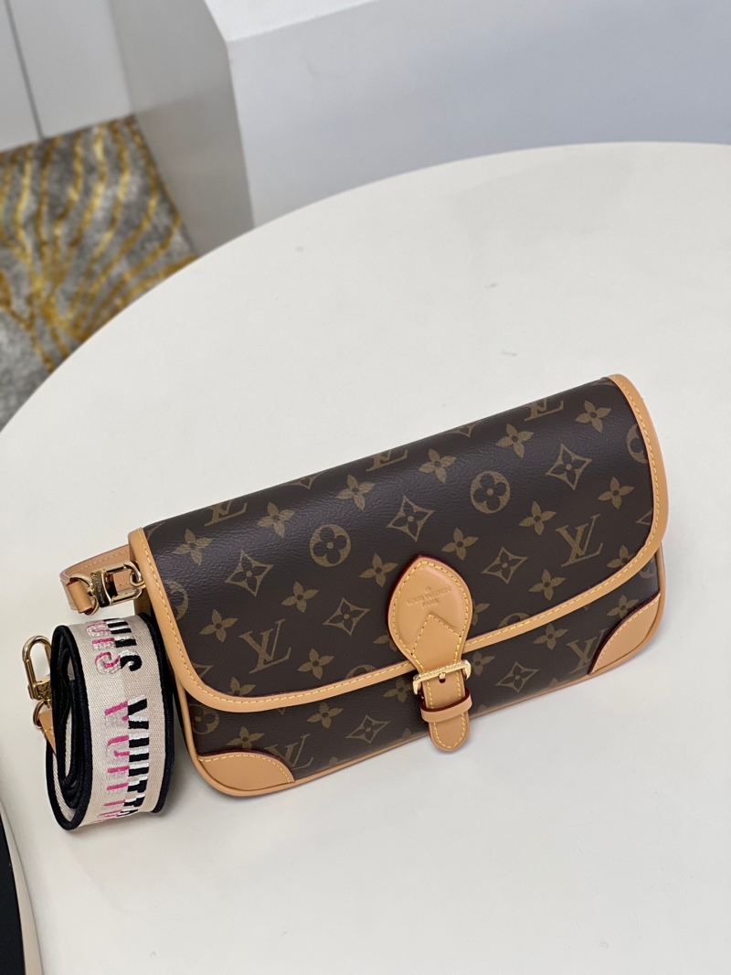 - 详细介绍:Diane 手袋重塑 1990 年代的经典设计,为 Monogram 帆布包身融入皮革包角和传统搭扣等复古元素,搭配口袋和齐整内层。宽幅提花肩带两面分别呈现醒目路易威登标识和 Monogram 花卉。