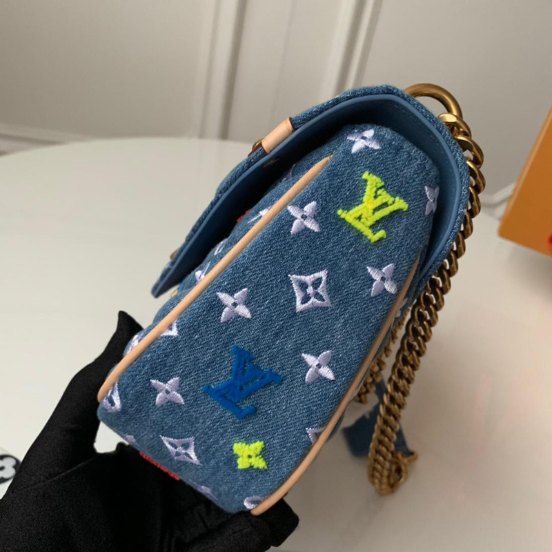 - 结构:牛仔布小牛皮饰边超细纤维内衬金色金属件路易威登刺绣标识手柄,可拆卸长链条肩带,配有皮质肩垫内贴袋