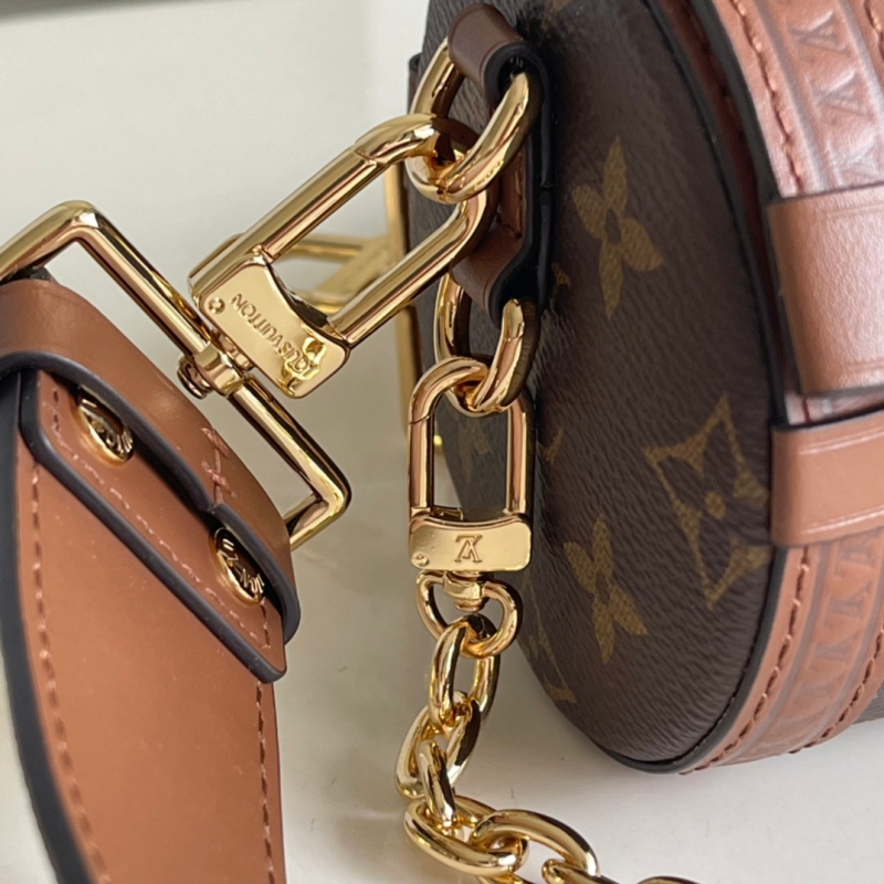 - 结构:Monogram 涂层帆布 牛皮革饰边 微纤维内衬 金属件 S-lock 锁扣 肩带:可拆卸,可调节 包带半长:30.0 厘米 包带半长可调至:52.0 厘米 链条:可拆卸 链条半长:55.0 厘米