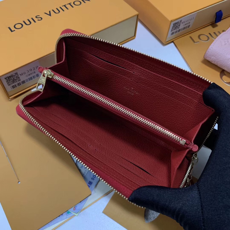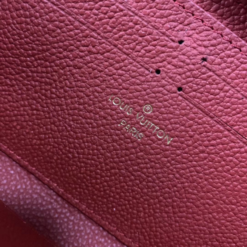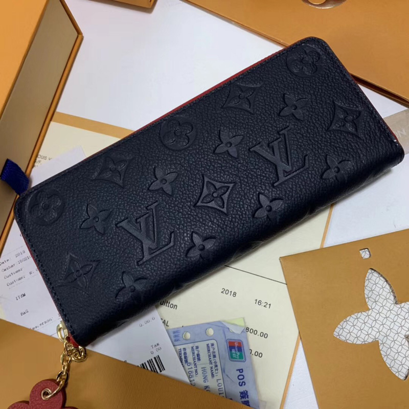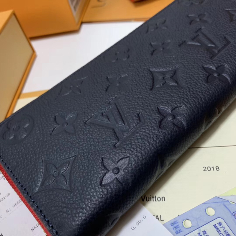 - 结构:海军蓝配红色 Monogram Empreinte 压纹皮革 牛皮内衬 金色金属件 拉链封口 2 个大号风琴隔层 拉链零钱袋 2 个贴袋 8 个卡片夹层
