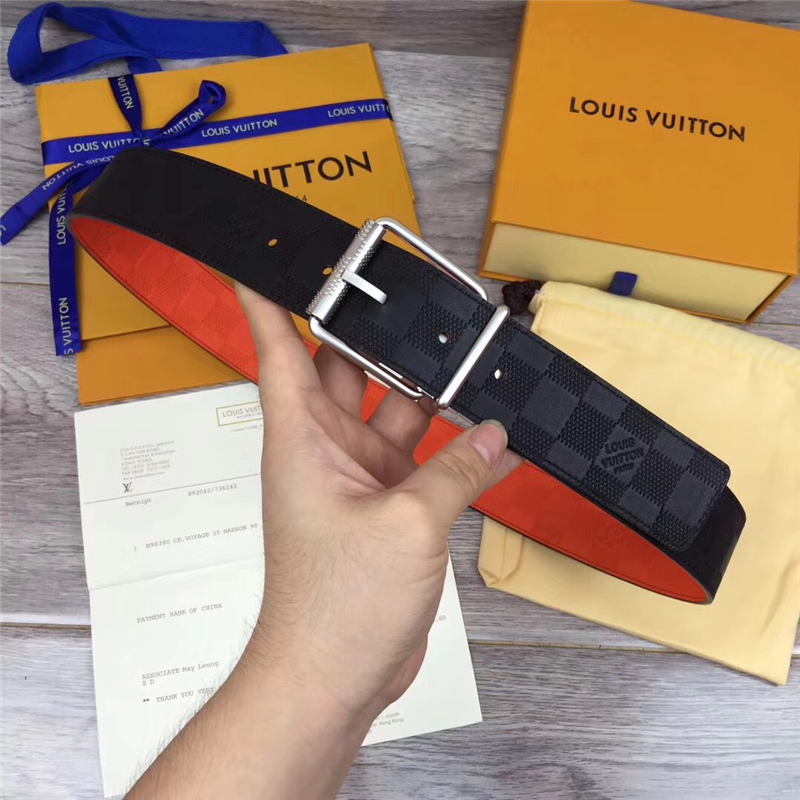 4 reviews for M9389 LV路易威登 进口小牛皮 双面双色格子纹 男士针扣皮带 橙黑银扣