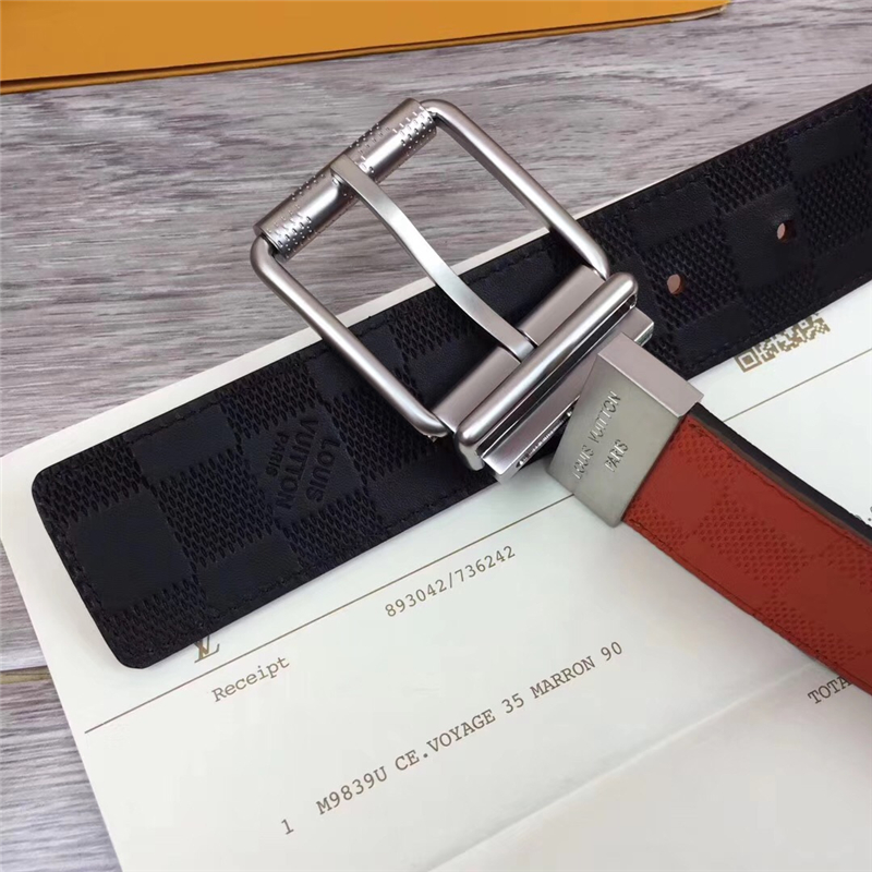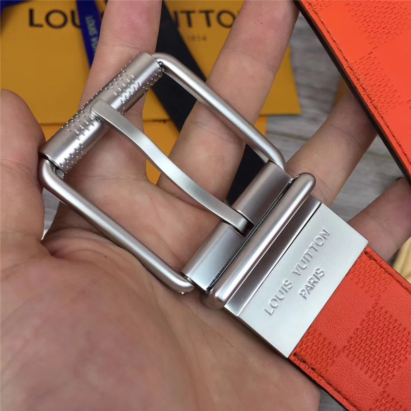 - M9389 LV路易威登 进口小牛皮 双面双色格子纹 男士针扣皮带 橙黑银扣