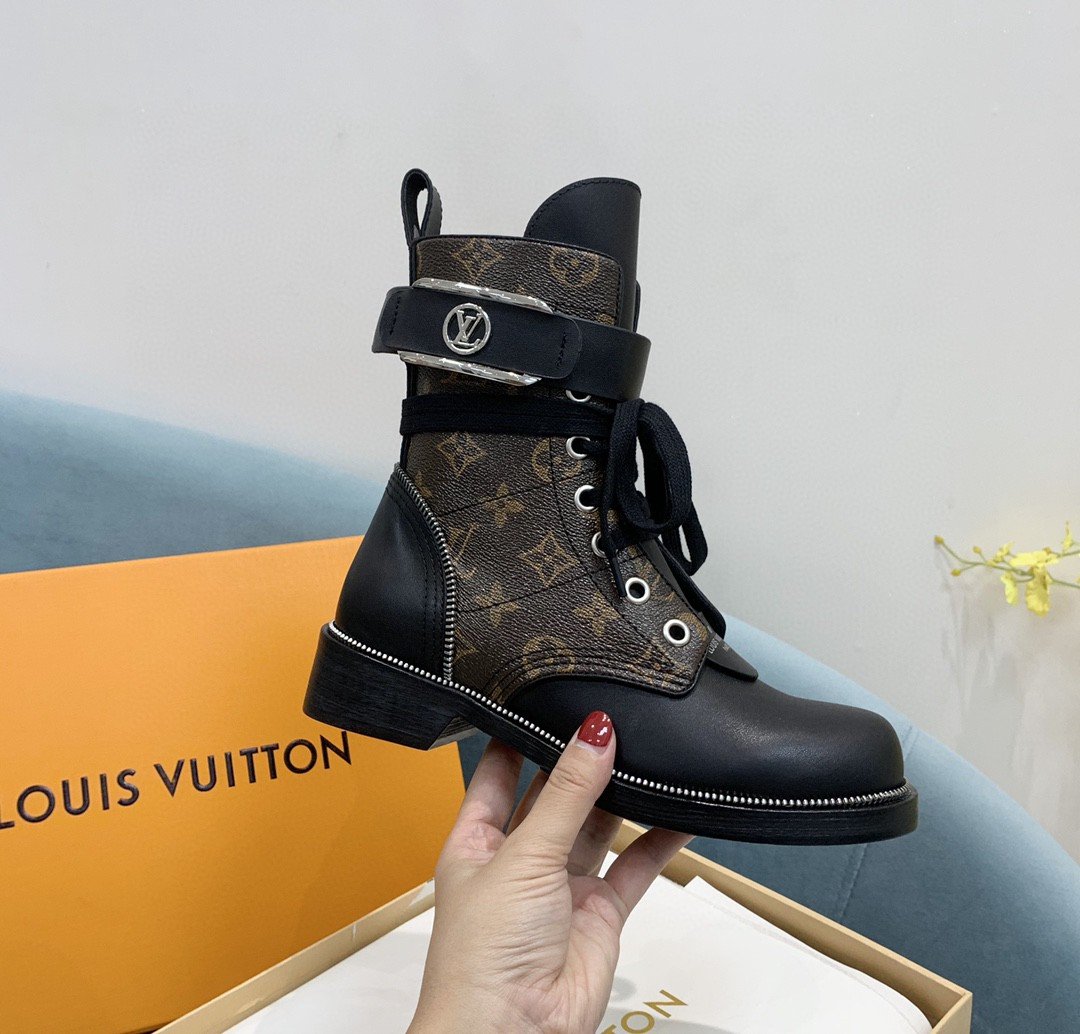 Monogram 帆布制成的 Metropolis Flat Ranger 是路易威登对流行军靴的诠释。该款式以精致的细节而著称,例如鞋舌上的贴片上刻有品牌标志的金色浮雕。耐磨的外底完善了此设计。
