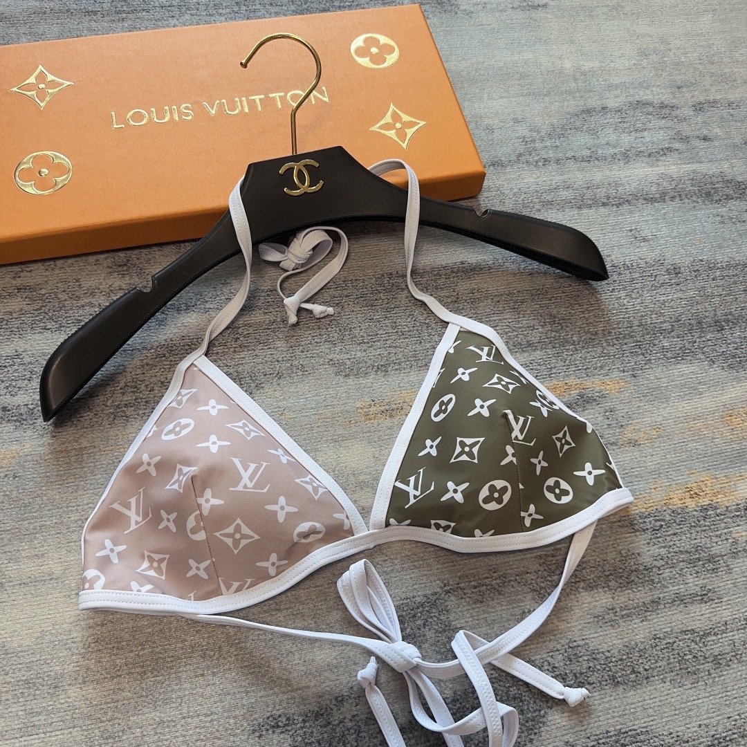 Go-to swimsuit is chic and summery in lightweight swimwear jersey featuring a tone-on-tone allover Monogram motif for a subtle signature finish with two color pink and greenkhaki, complete with playful Monogram Flower accents on the front. The effortless halter-neck triangle shape is tied with casual laces around the neck and back.