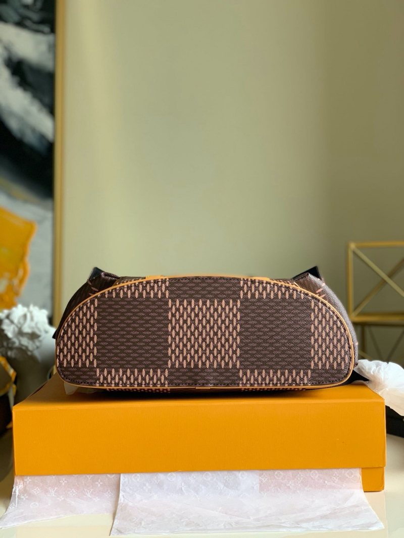 - 结构:Giant Damier Ebene 和 Monogram 涂层帆布 织物内衬 牛皮饰边 金属件 顶部皮革手柄 翻盖开合 按扣和抽绳开合 侧袋 iPad 内袋 拉链内袋 内贴袋 手柄:单手柄