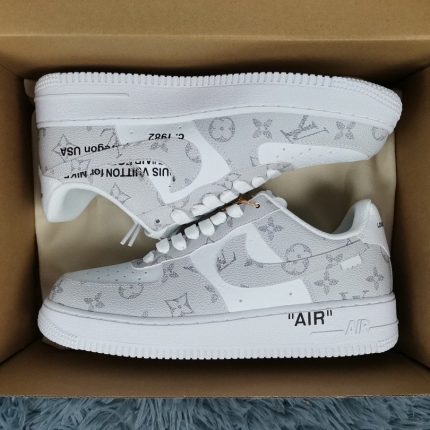 LOUIS VUITTON * NIKE AIR FORCE 1 由 Virgil Abloh 为 Louis Vuitton 设计,灵感来自经典篮球运动鞋,LV Trainer 运动鞋是鞋履系列的标志。该版本采用 Monogram 牛仔布材质,配有带注入 Monogram 花朵的尼龙搭扣带。上部的精心构造。路易威登工匠花了 7 个小时缝制。