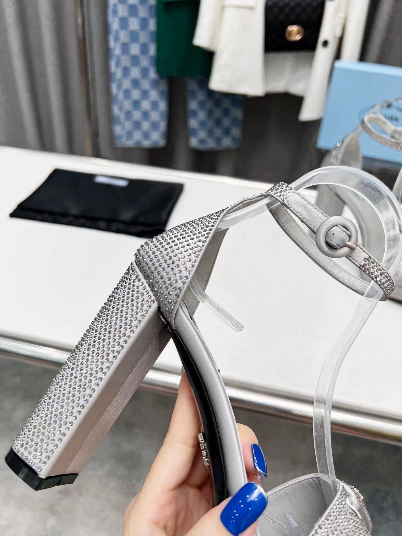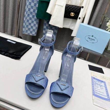 这款高跟缎面厚底凉鞋的特点是大胆的魅力,上面镶嵌着水晶,营造出光线和虹彩反射的效果表面。略带衬垫的皮革细节呈现的三角形徽标增添了现代主义气息。