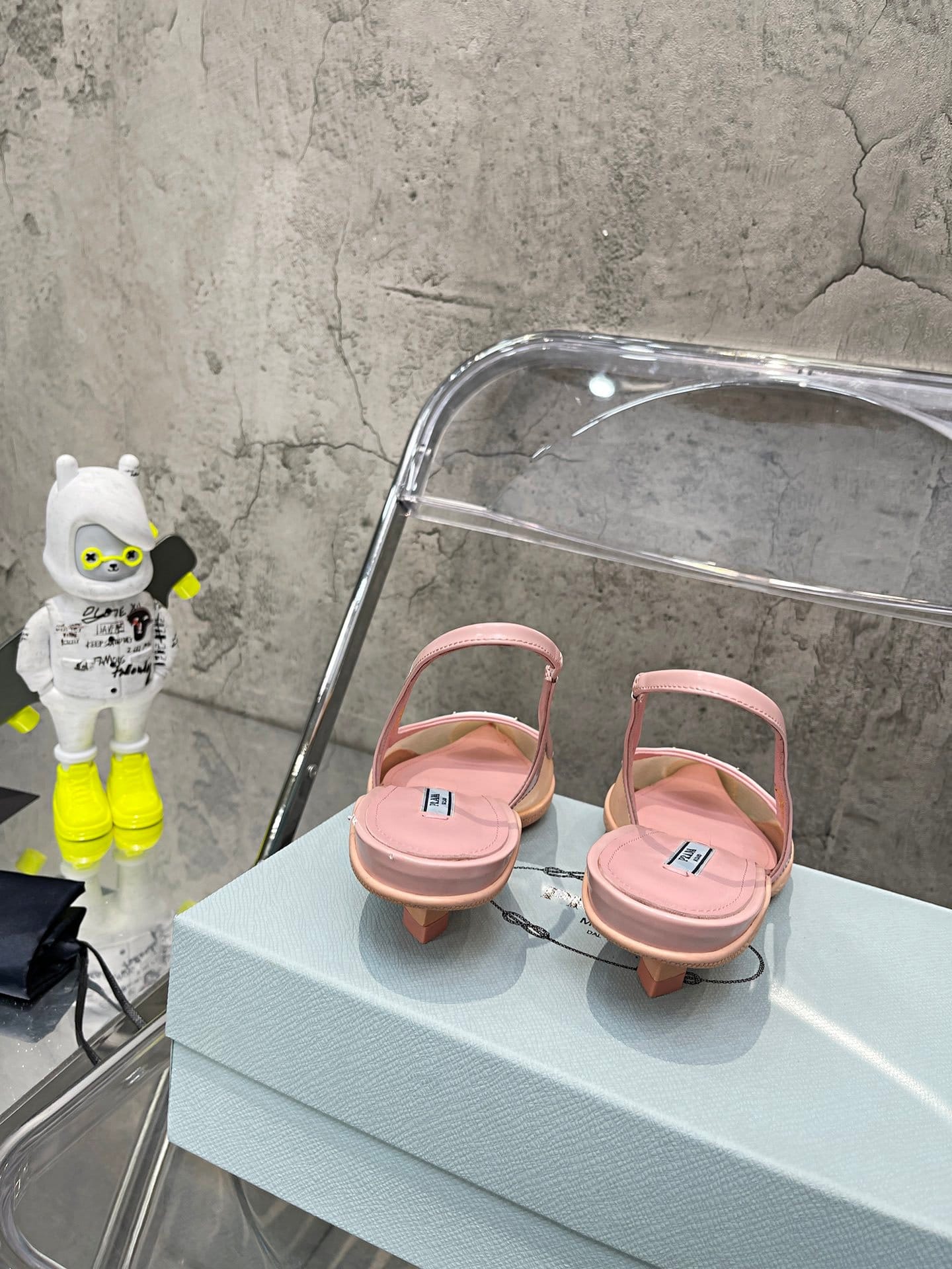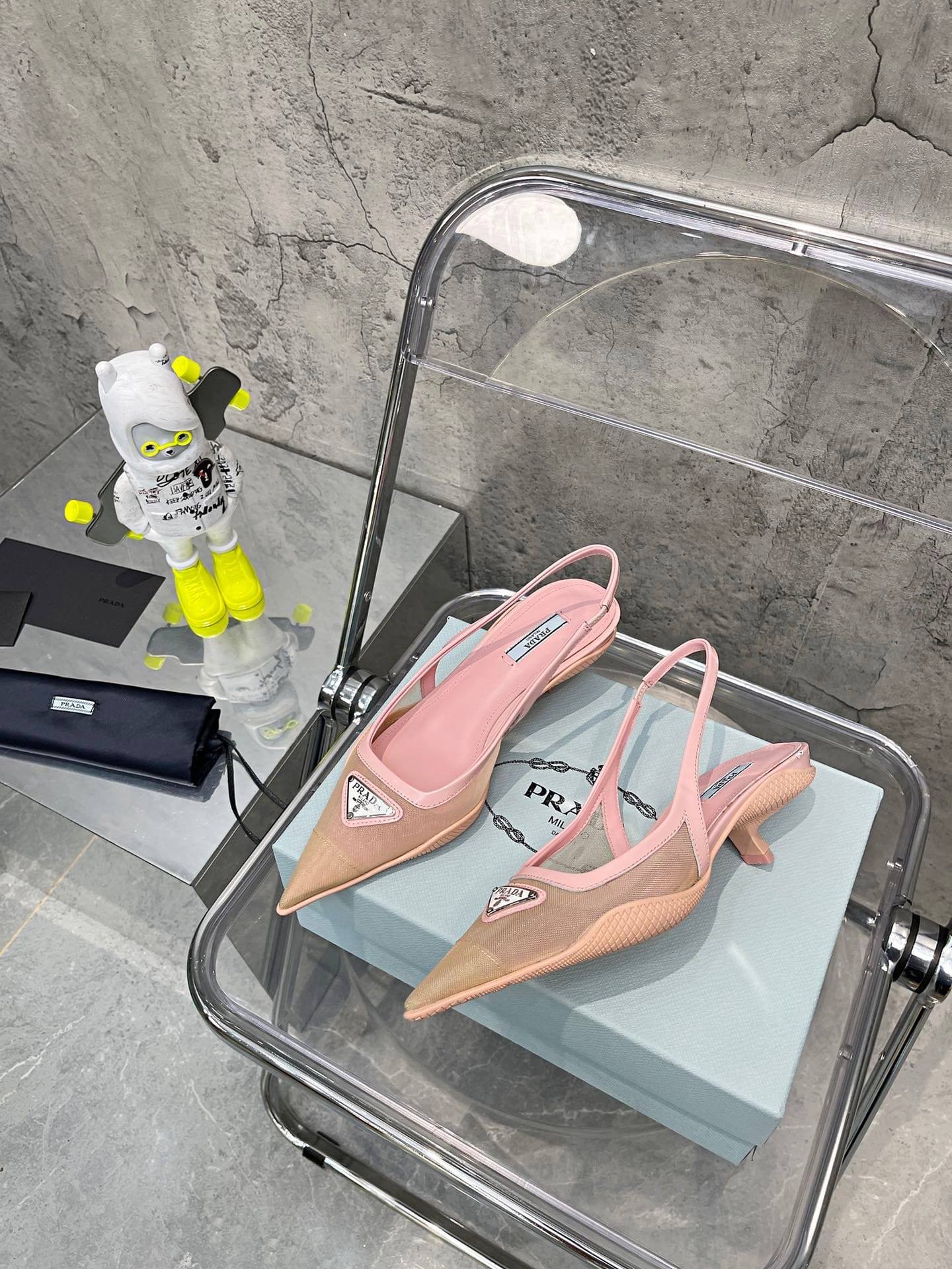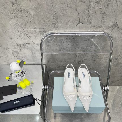 重新审视 Prada 九十年代档案中的设计,橡胶鞋底紧贴这些露跟高跟鞋的网状鞋面,形成微妙的对比材质融合了女性化的廓形和运动风格。逗号鞋跟的灵感源自同一十年的风格,是近期系列的独特风格。鞋子上有标志性的搪瓷金属三角标志。