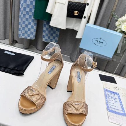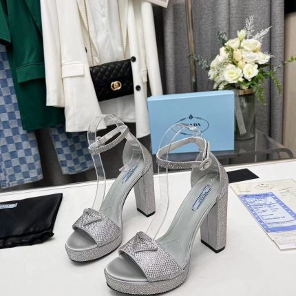 这款高跟缎面厚底凉鞋的特点是大胆的魅力,上面镶嵌着水晶,营造出光影效果和虹彩反射效果。表面。略带衬垫的皮革细节呈现的三角形徽标增添了现代主义气息。