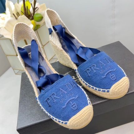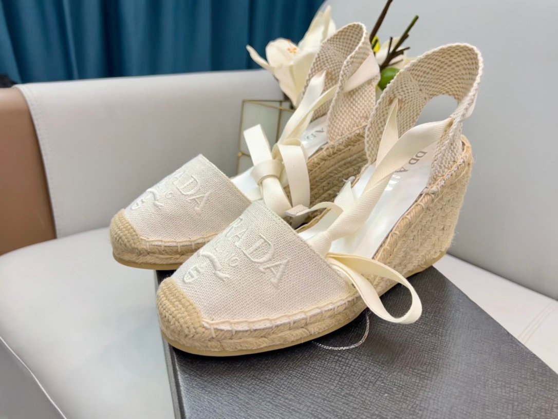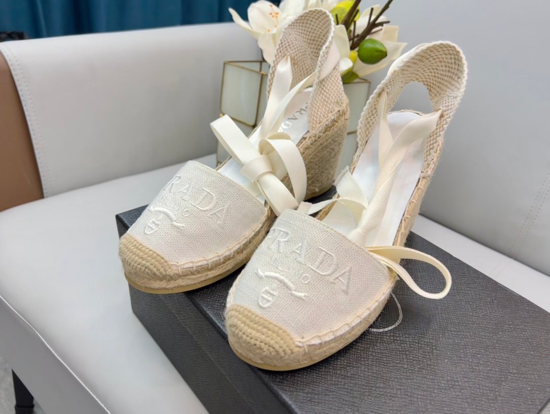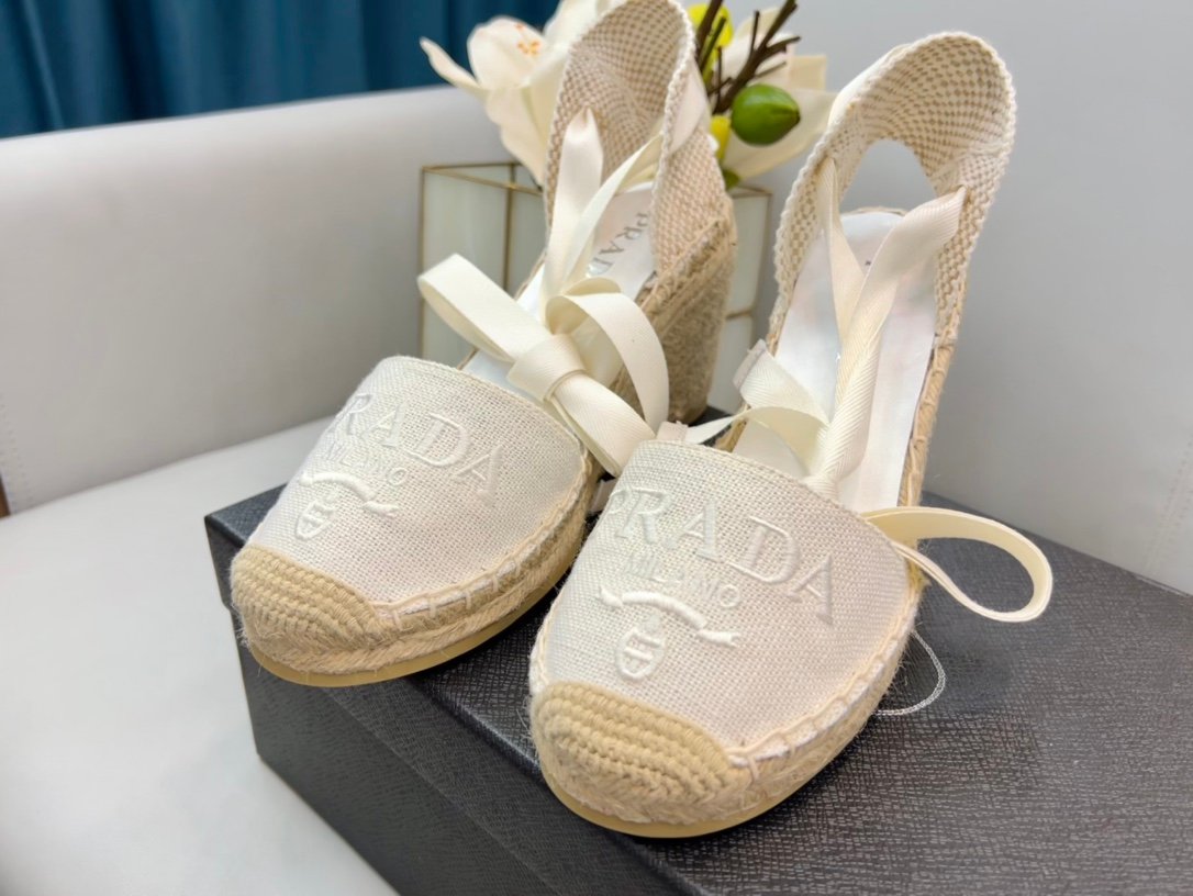 Prada 女式亚麻麻底坡跟凉鞋白色 3.5 英寸/90 毫米 PRD