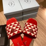 这些拖鞋体现了 Prada 系列一贯的图形印花理念,时尚的设计通过对标志性三角形图形图案的全新诠释。表带上饰有最经典版本的珐琅金属三角标志。