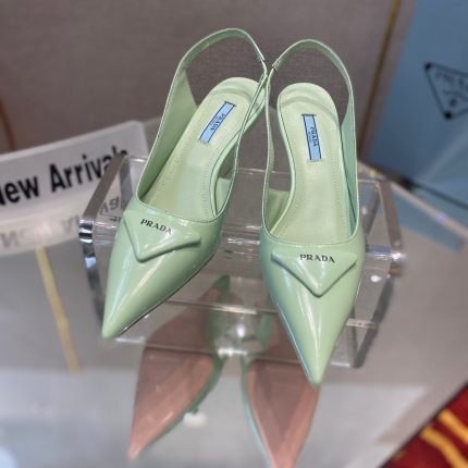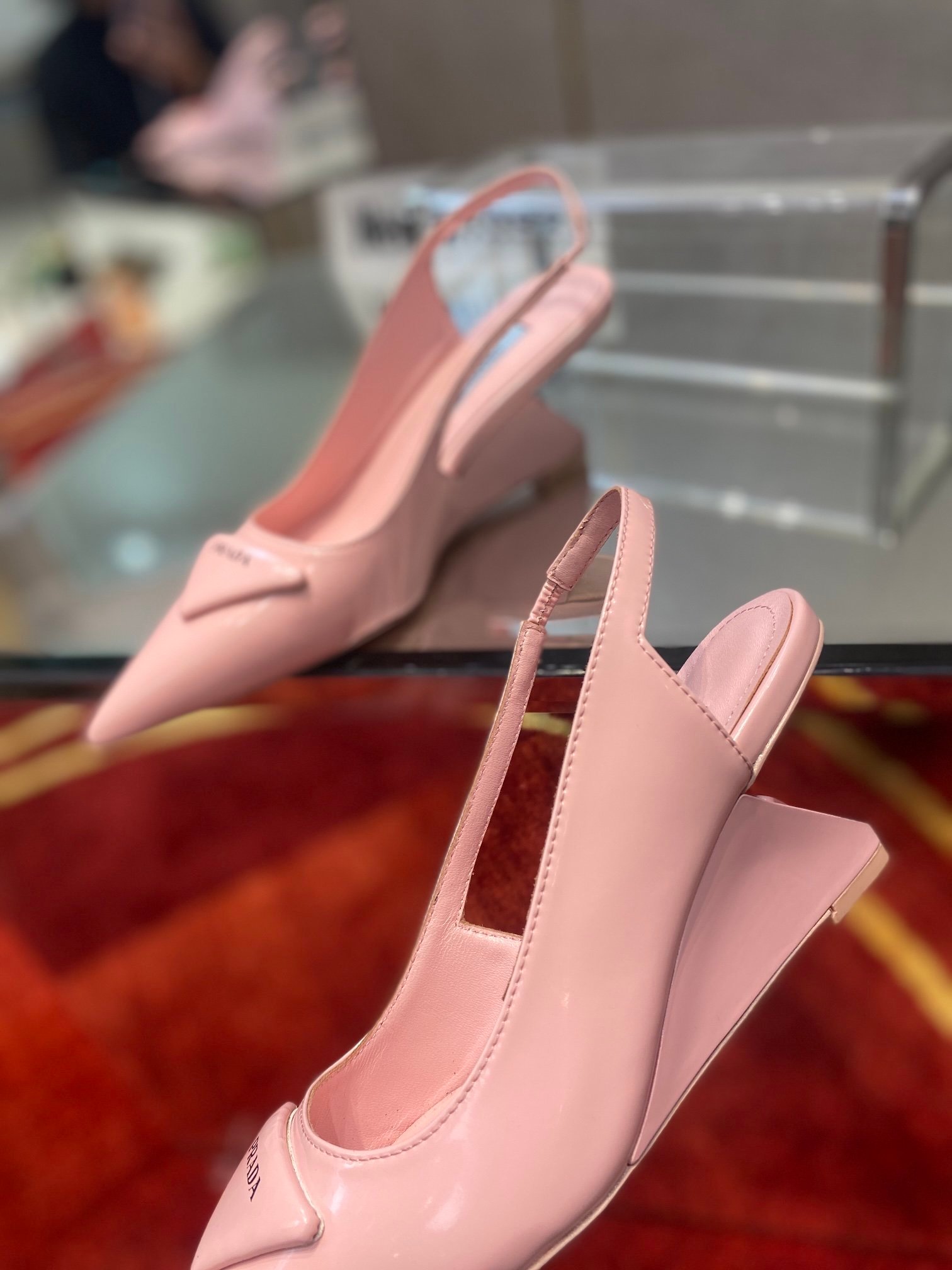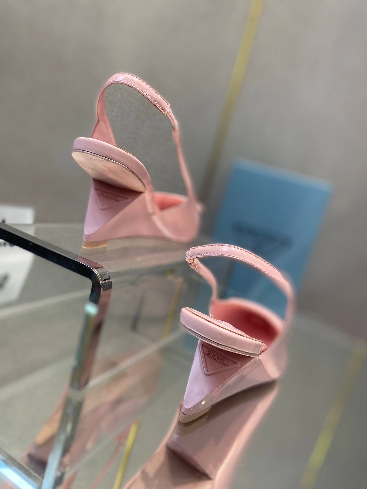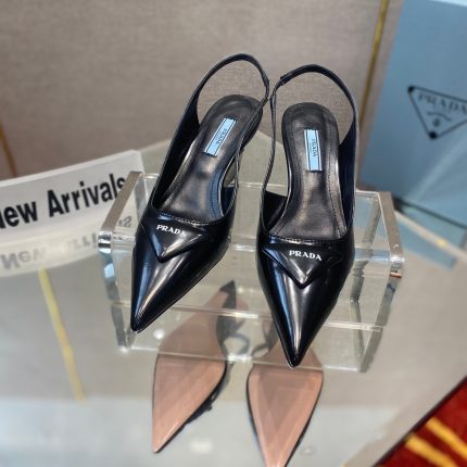 极简主义和女性气质在露跟鞋(Prada 系列的标志性风格)的全新诠释中相遇。尖头鞋型和现代主义坡跟鞋款重新演绎了该品牌独特三角形的几何形状,其形状启发了鞋跟结构以及包覆和轻微加垫的前部细节。体积和结构的运用强调了鞋子干净、果断的线条,采用精细拉丝和漆面制成。