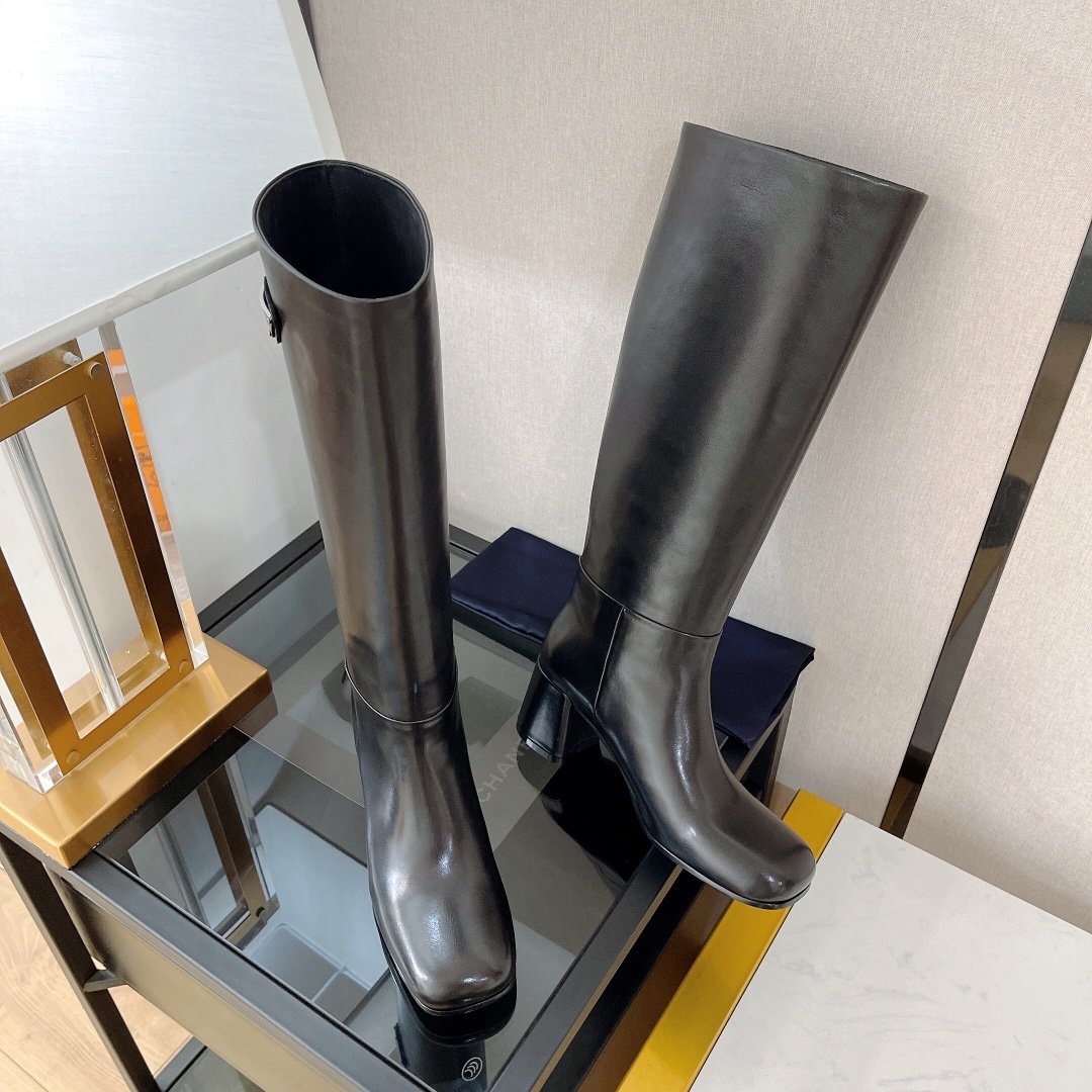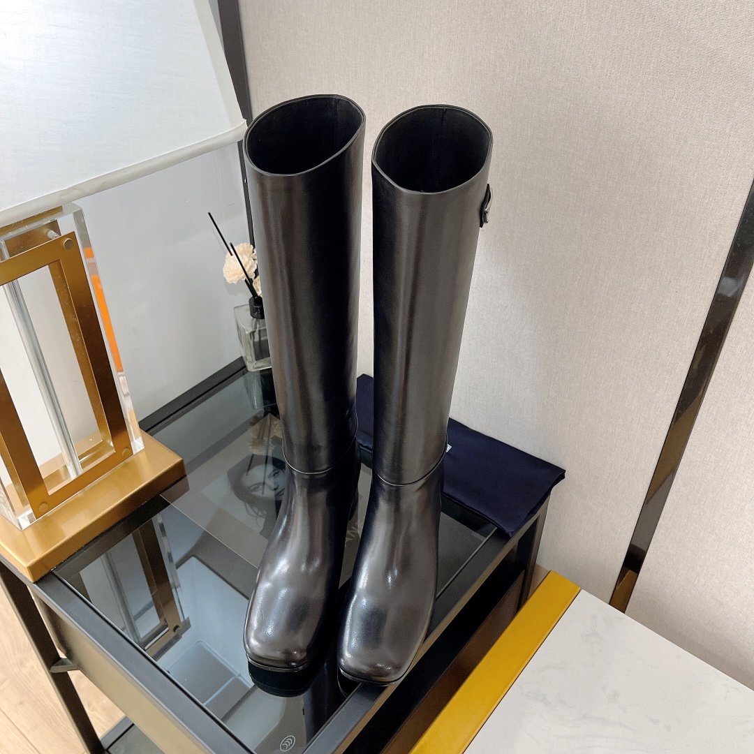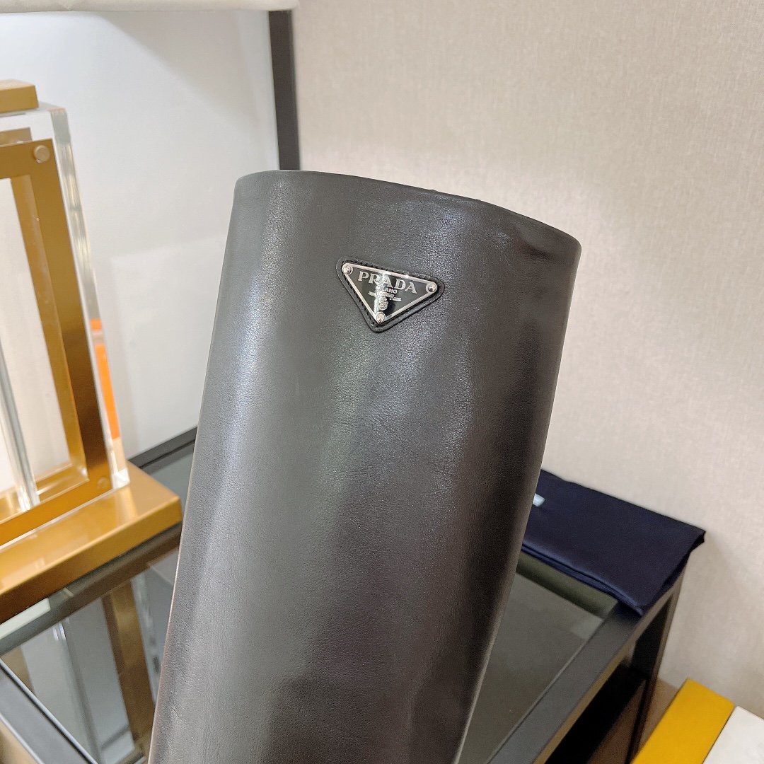 这款中跟及膝靴具有经典永恒的线条。珐琅金属三角形标志首次出现在 Mario Prada 于 1913 年设计的旅行箱上,为靴子增添了标志性的音符。