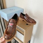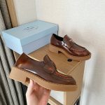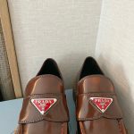乐福鞋经过重新设计,采用尖头设计,让人想起 Prada 档案设计。鞋面正式而优雅,延续了创新浅色鞋底的美感。自九十年代起传统上用于精美经典鞋履的拉绒在 Prada 系列中以意想不到的设计进行了重新诠释。