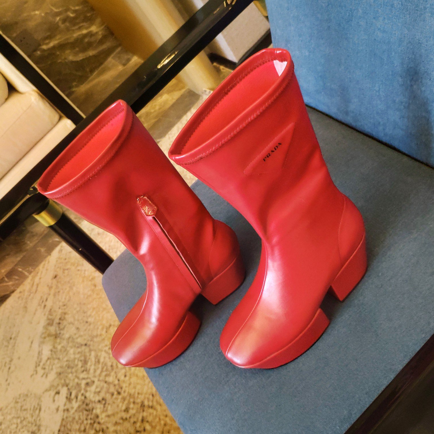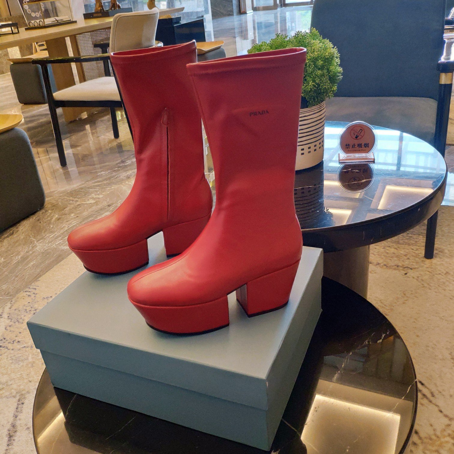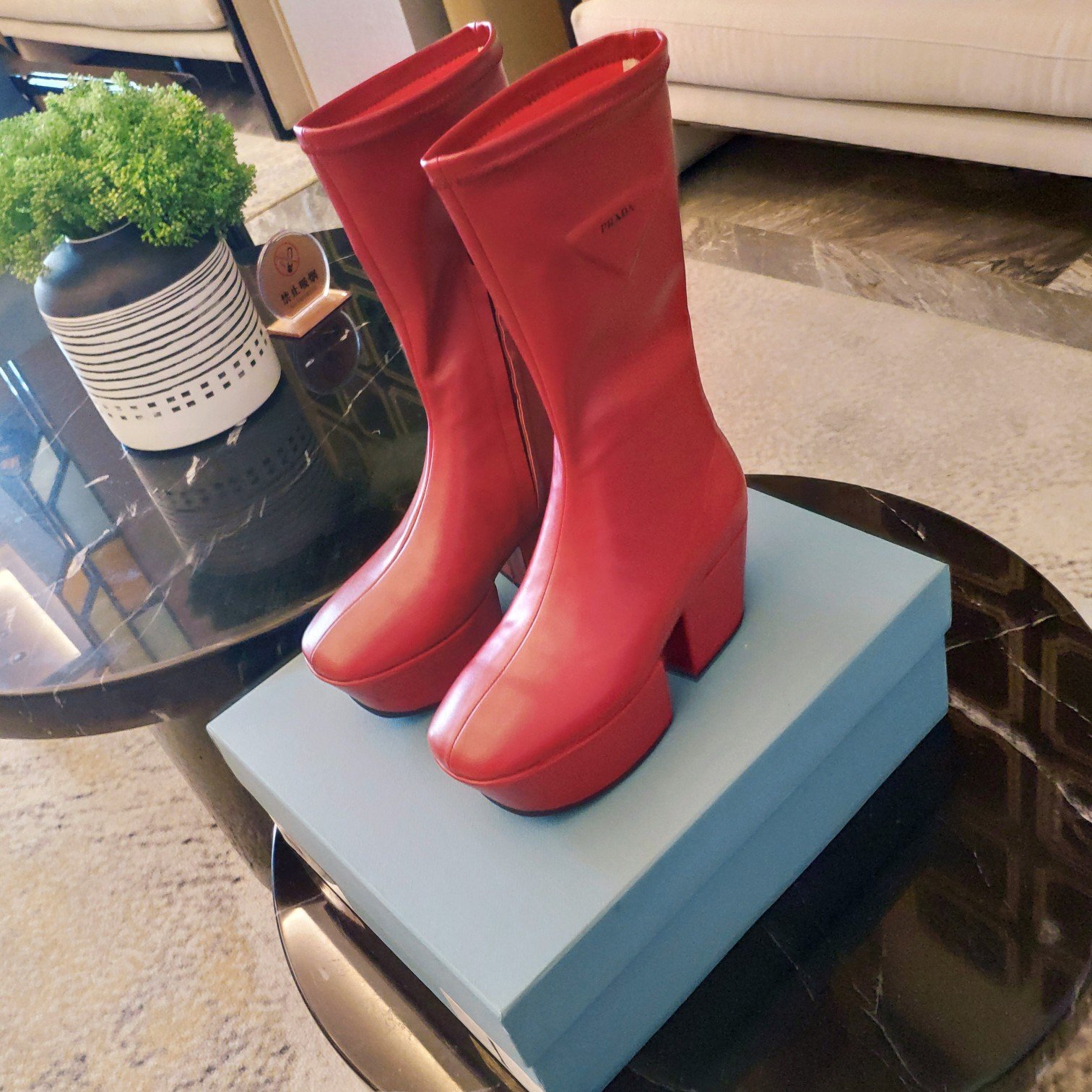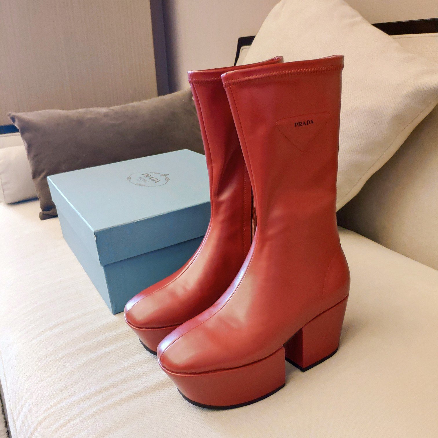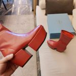 Prada 徽标厚底靴子红色 女式 2.9 英寸/7.5 厘米 PRD