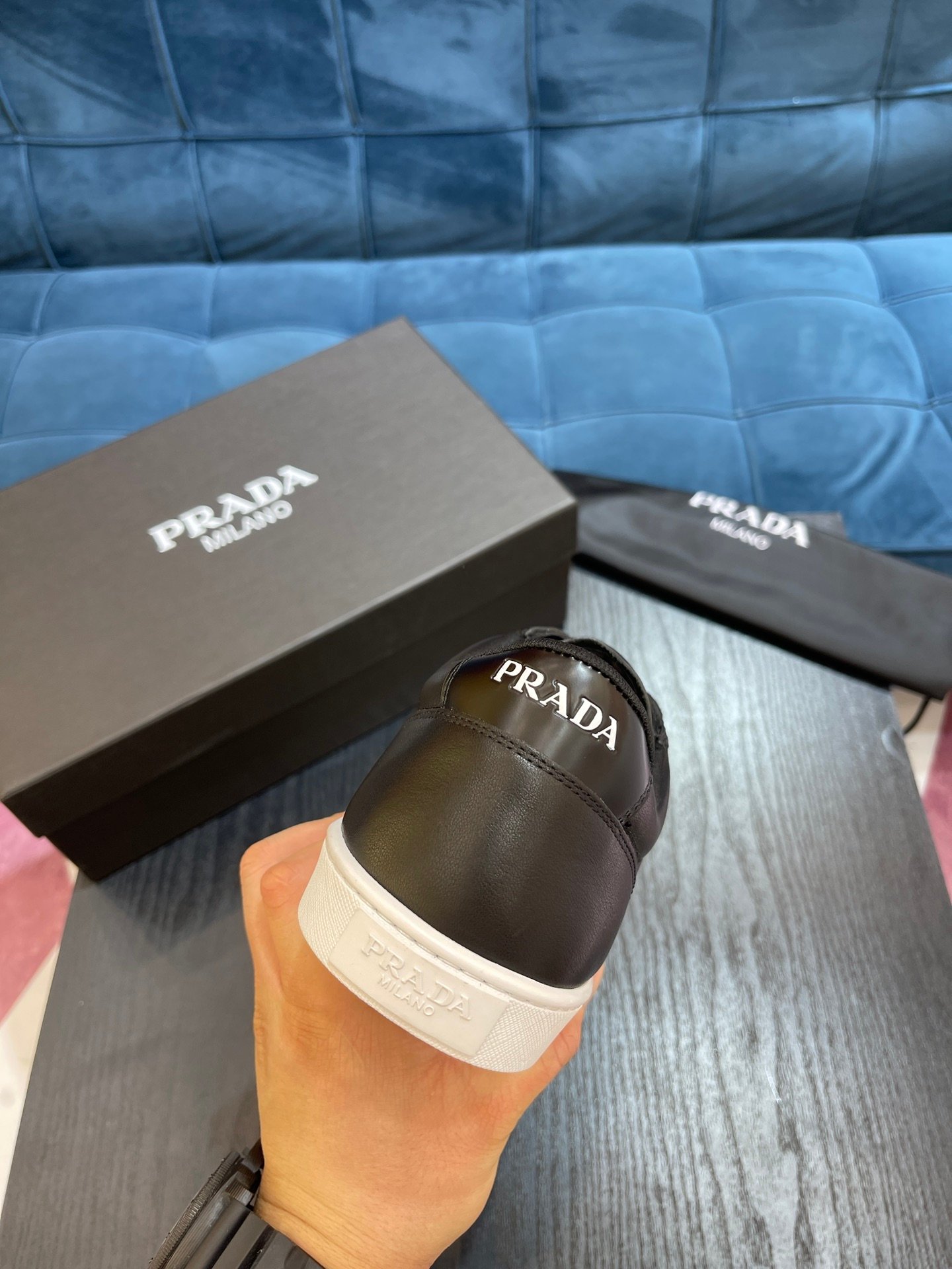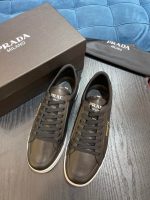 自 90 年代以来,传统上用于精美经典鞋履的拉丝在 Prada 系列中以当代设计重新诠释,例如这些带有流畅的线条:混合风格体现了品牌的双重性。搪瓷金属三角标志装饰鞋子。