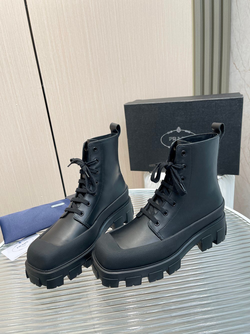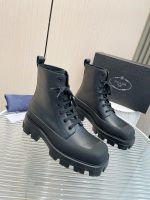 具有光泽效果的光滑表面定义了这些系带短靴,由包裹鞋面的外壳强调 – 一个反复出现的元素普拉达 (Prada) 鞋履。超大而轻盈的膨胀橡胶鞋底引入了有趣的体积和风格对比,反映了 Prada 系列固有的二元性。